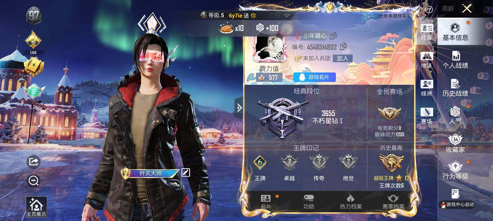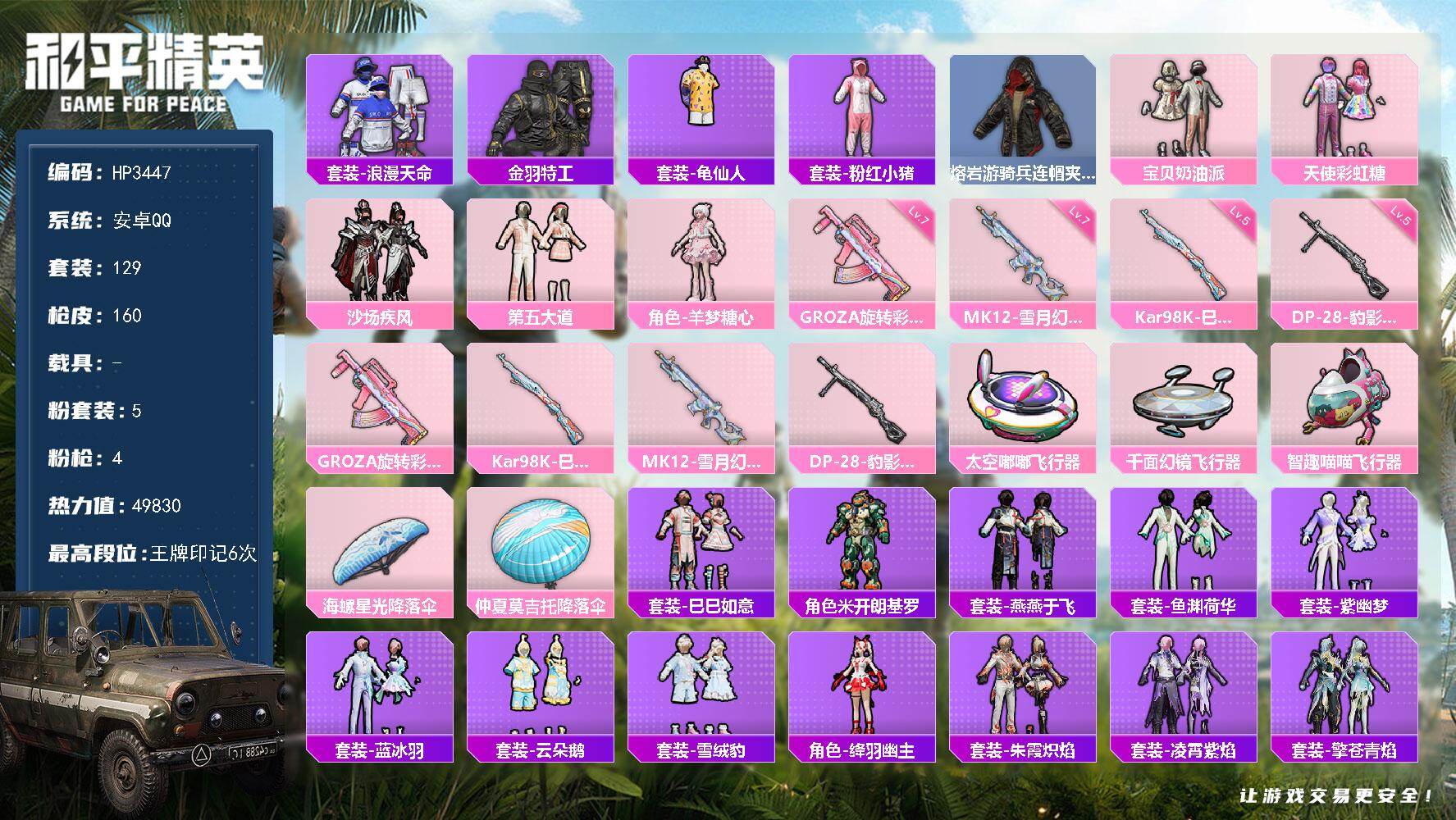 【HP3447】129套装/枪械4/装备187/战备95/王牌印记6/热力值49830/七级GROZA-旋转彩虹/五级Kar98K-巳巳如意/七级MK12-雪月幻音/五级DP-28-豹影疾电/套装-浪漫天命/套装-金羽特工/套装-龟仙人/套装-粉红小猪/熔岩游骑兵连帽夹克/粉装-宝贝奶油派/粉装-天使彩虹糖/粉装-沙场疾风/粉装-第五大道/角色-羊梦糖心/GROZA-旋转彩虹/Kar98K-巳巳如意/MK12-雪月幻音/DP-28-豹影疾电/太空嘟嘟飞行器/千面幻镜飞行器/智趣喵喵飞行器/海螺星