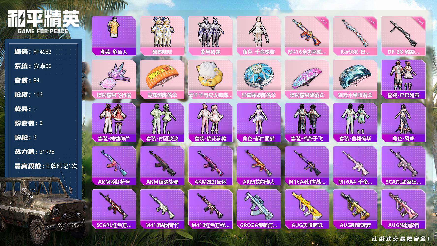 【HP4083】84套装/枪械3/装备128/战备69/王牌印记1/热力值31996/七级M416-全功率超战/五级Kar98K-巳巳如意/五级DP-28-豹影疾电/套装-龟仙人/粉装-酣梦娃娃/粉装-紫电风暴/角色-千金淑猫/M416-全功率超战/Kar98K-巳巳如意/DP-28-豹影疾电/炫彩糖果飞行器/龙珠超降落伞/喜羊羊与灰太狼降落伞/异瞳寒姬降落伞/炫彩糖果降落伞/辉云木星降落伞/套装-巳巳如意/套装-雪国风尚/套装-糖糖葫芦/套装-青团波波/套装-棉花软糖/角色-都市丽猫/套装-燕