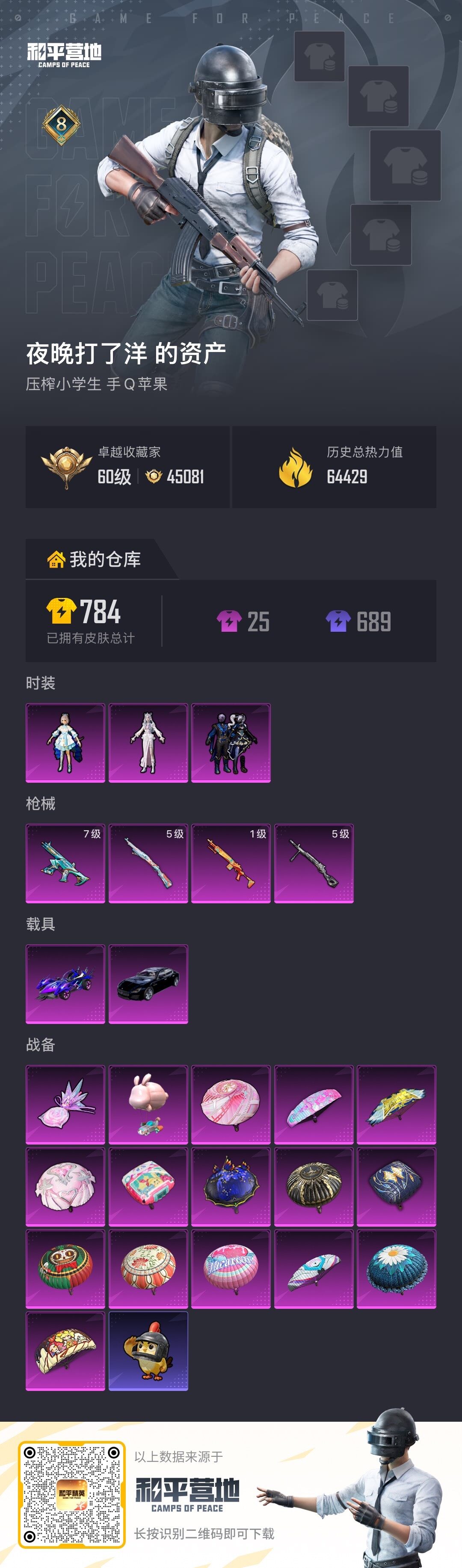 175套装/枪械4/装备227/载具2/战备152/王牌印记8/热力值64429/