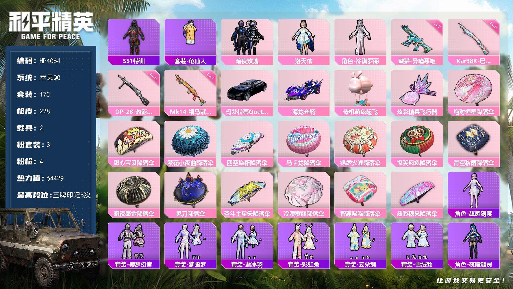 【HP4084】175套装/枪械4/装备227/载具2/战备152/王牌印记8/热力值64429/七级蜜獾-异瞳寒姬/五级Kar98K-巳巳如意/一级Mk14-福马献瑞/五级DP-28-豹影疾电/套装-SS1特训/套装-龟仙人/粉装-暗夜玫瑰/角色-洛天依/角色-冷漠罗丽/玛莎拉蒂Quattroporte(夜幕蓝)/海龙奔腾/僚机-萌兔起飞/蜜獾-异瞳寒姬/Kar98K-巳巳如意/Mk14-福马献瑞/DP-28-豹影疾电/炫彩糖果飞行器/绝对恒星降落伞/甜心宝贝降落伞/繁花小夜曲降落伞/四圣焕新
