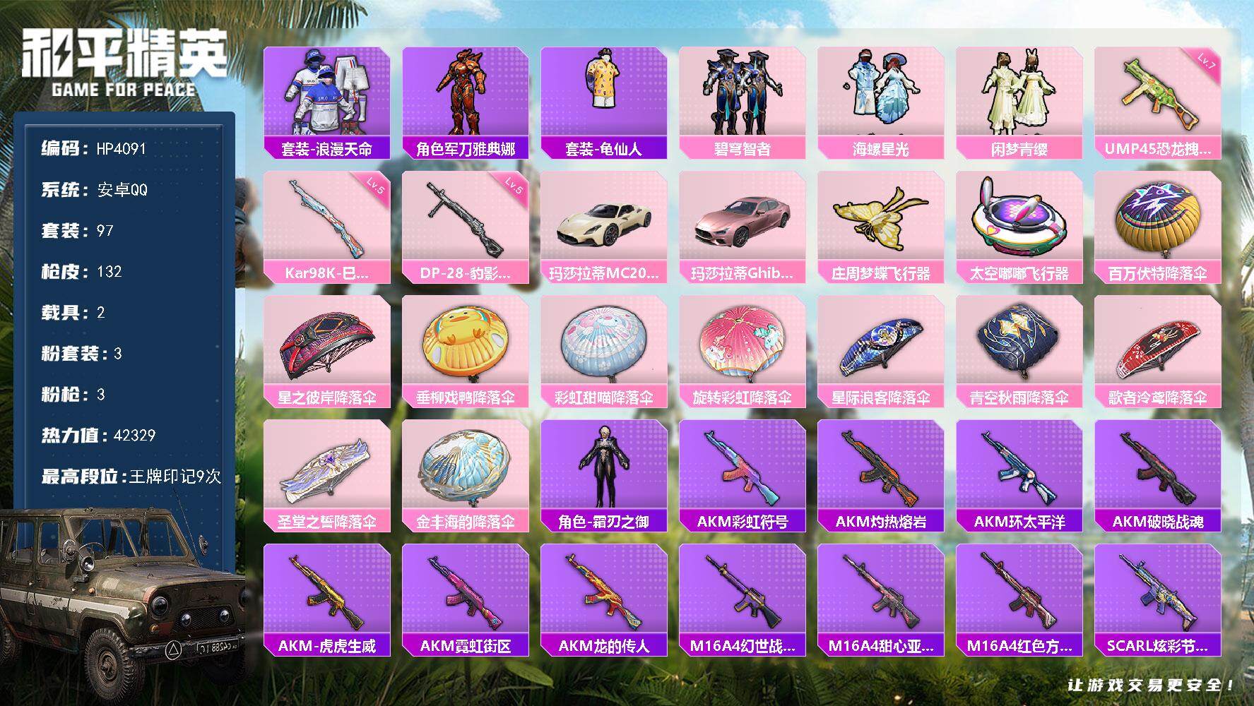 【HP4091】97套装/枪械3/装备149/载具2/战备94/王牌印记9/热力值42329/七级UMP45-恐龙拽拽/五级Kar98K-巳巳如意/五级DP-28-豹影疾电/套装-浪漫天命/角色-军刀雅典娜/套装-龟仙人/粉装-碧穹智者/粉装-海螺星光/粉装-闲梦青缨/玛莎拉蒂MC20(星石白)/玛莎拉蒂Ghibli(粉)/UMP45-恐龙拽拽/Kar98K-巳巳如意/DP-28-豹影疾电/庄周梦蝶飞行器/太空嘟嘟飞行器/百万伏特降落伞/星之彼岸降落伞/垂柳戏鸭降落伞/彩虹甜喵降落伞/旋转彩虹降