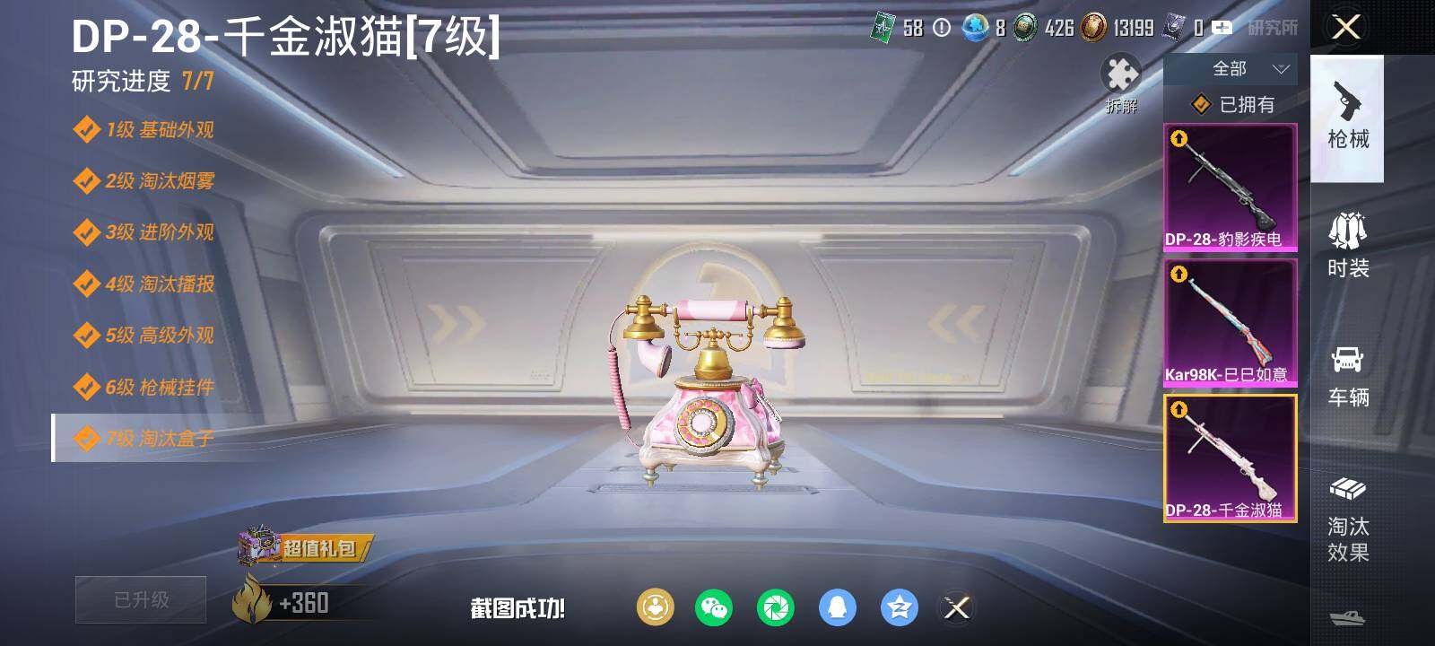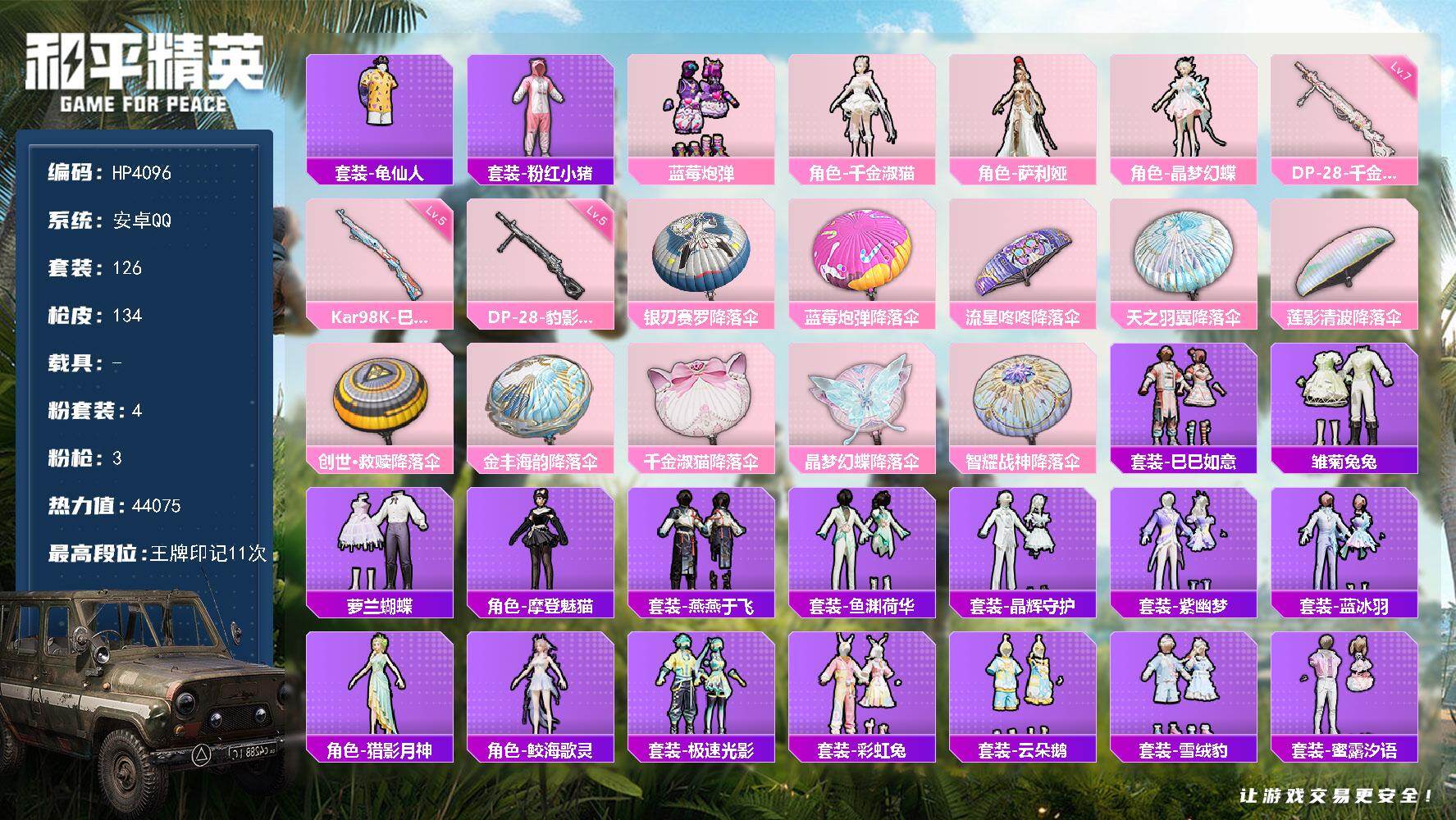 【HP4096】126套装/枪械3/装备153/战备98/王牌印记11/热力值44075/五级Kar98K-巳巳如意/七级DP-28-千金淑猫/五级DP-28-豹影疾电/套装-龟仙人/套装-粉红小猪/粉装-蓝莓炮弹/角色-千金淑猫/角色-萨利娅/角色-晶梦幻蝶/Kar98K-巳巳如意/DP-28-千金淑猫/DP-28-豹影疾电/银刃赛罗降落伞/蓝莓炮弹降落伞/流星咚咚降落伞/天之羽翼降落伞/莲影清波降落伞/创世·救赎降落伞/金丰海韵降落伞/千金淑猫降落伞/晶梦幻蝶降落伞/智耀战神降落伞/套装-巳