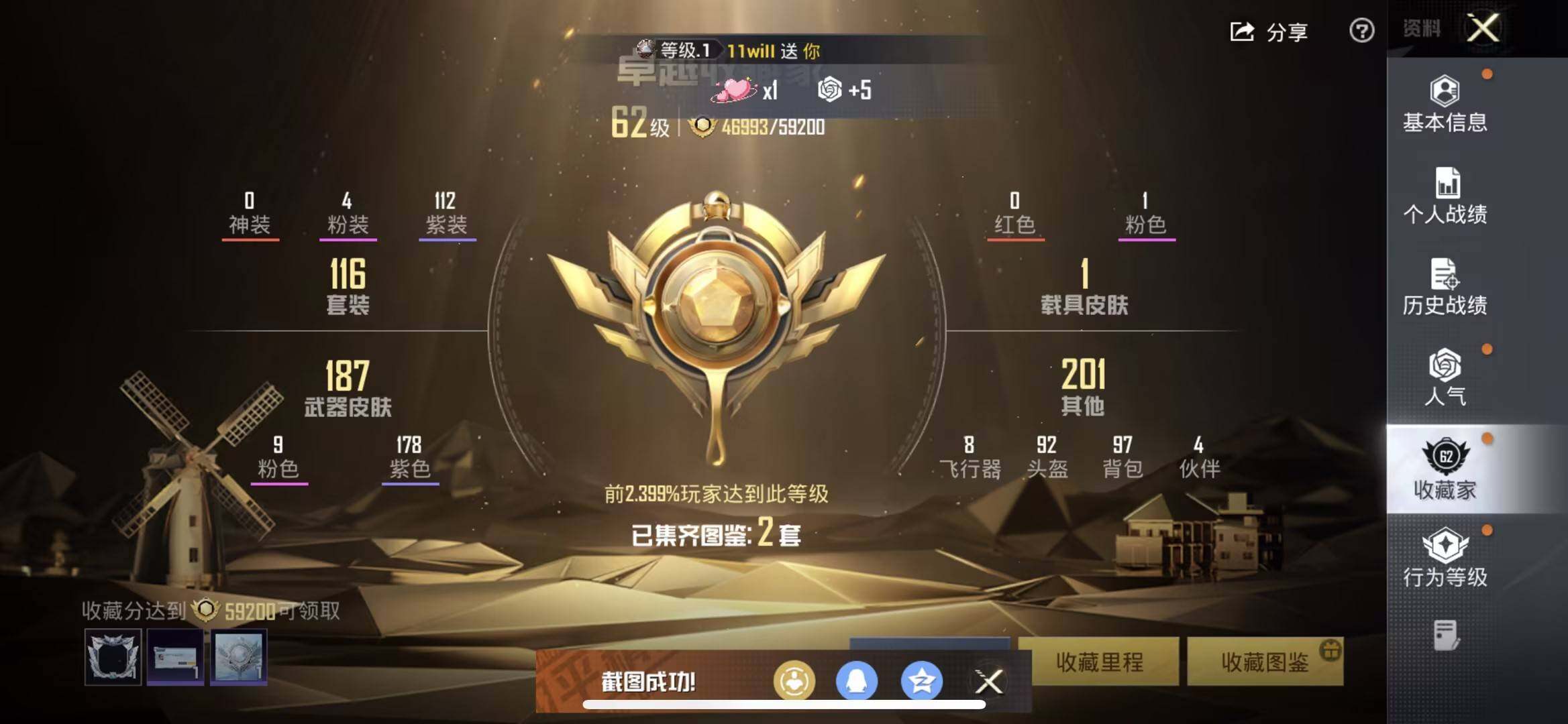 116套装/枪械9/装备224/载具1/战备144/王牌印记8/