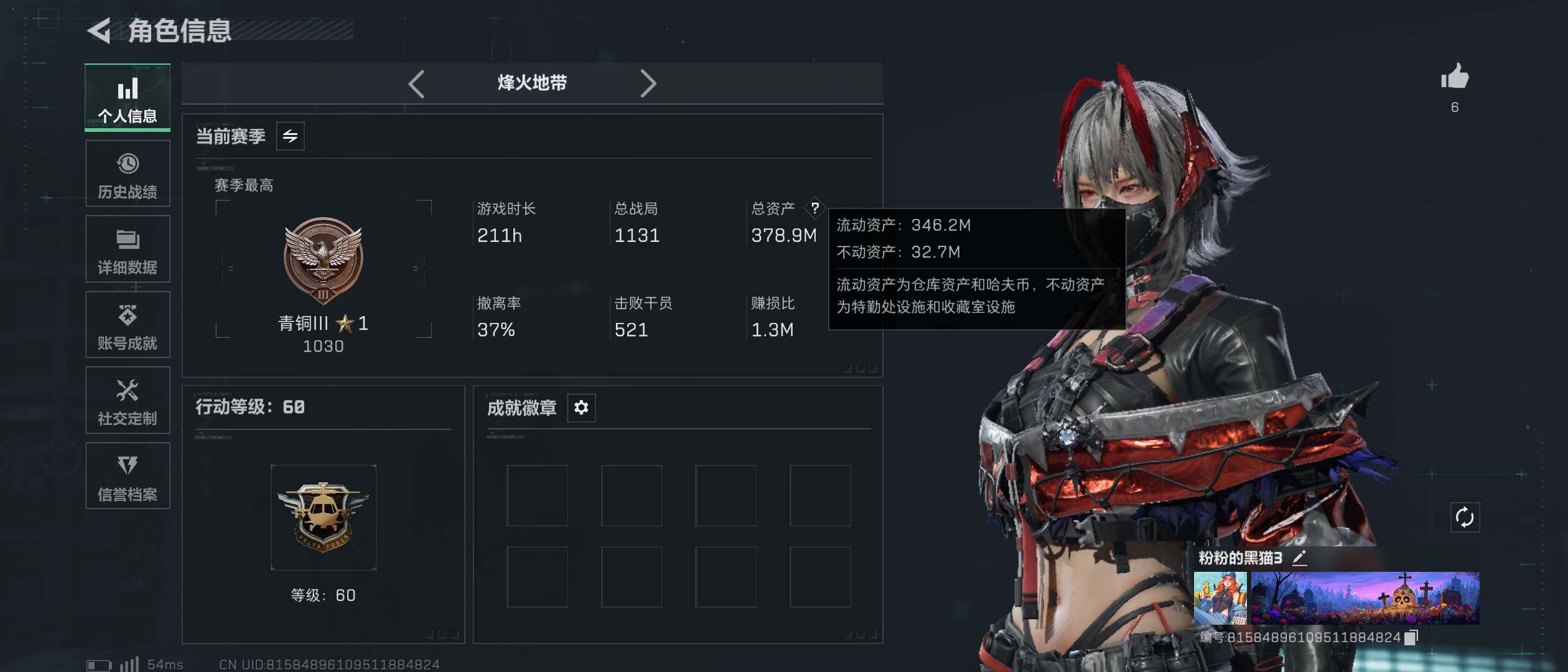 总资产(M):378M/哈夫币(K):96308K/传说枪皮数:8/全面战场等级:1_段位:无段位/烽火地带等级:60_段位:青铜/