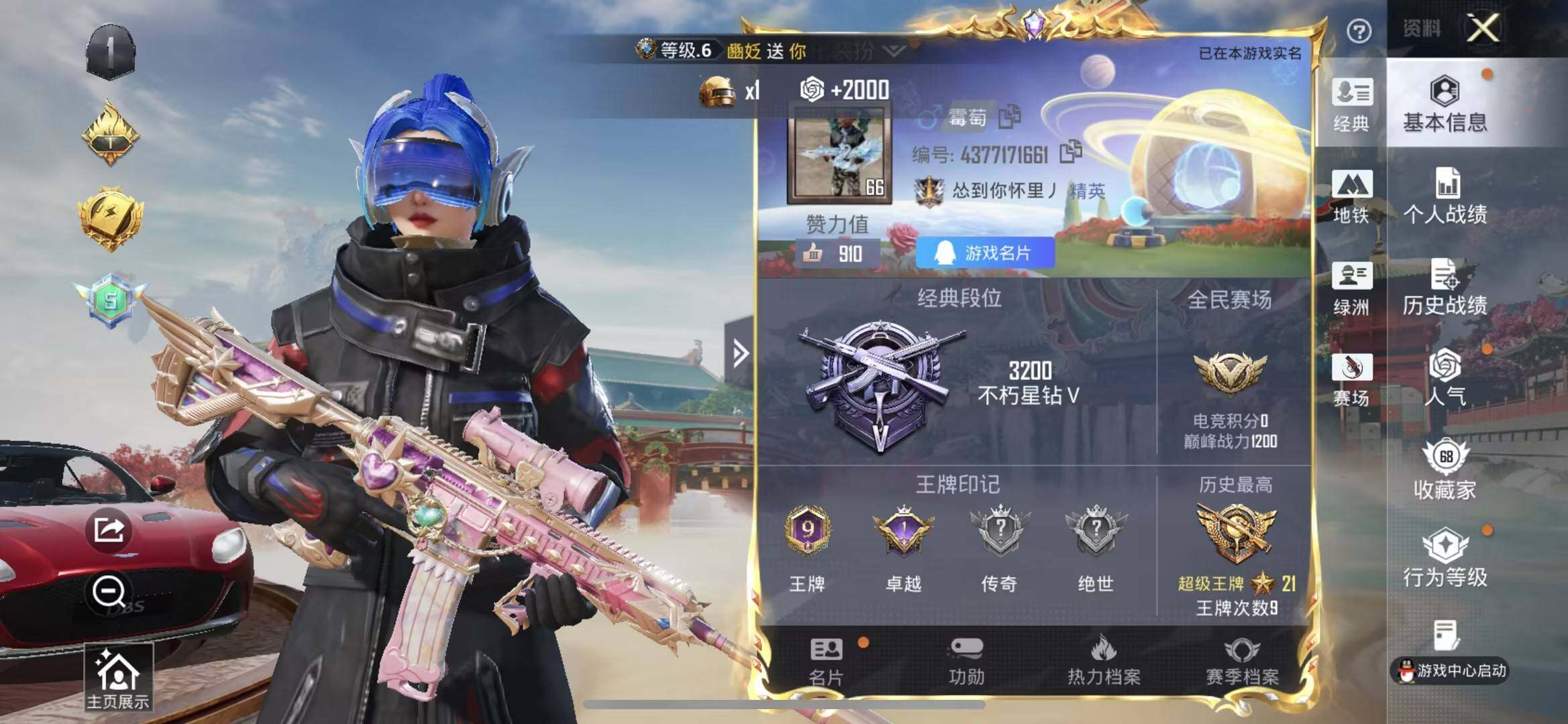 【HP3600】175套装/枪械3/装备282/载具2/战备139/王牌印记9/热力值77804/七级AKM-梦之光华/七级M416-心之恋语/五级Kar98K-巳巳如意/粉装-梦幻火箭/套装-深海小丑鱼/套装-小丑鱼/套装-奇异狩猎者/套装-龟仙人/套装-浪漫波比/套装-粉红小猪/粉装-幻影战神/粉装-数码大师/粉装-天使彩虹糖/粉装-绿野柔风/粉装-炙焰赤龙/粉装-飓风飞鹰/粉装-暗夜玫瑰/角色-赛罗闪耀型/粉装-彩虹鹿灵/粉装-山涧鹿灵/粉装-沙场疾风/角色-冷漠罗丽/兰博基尼Aventa