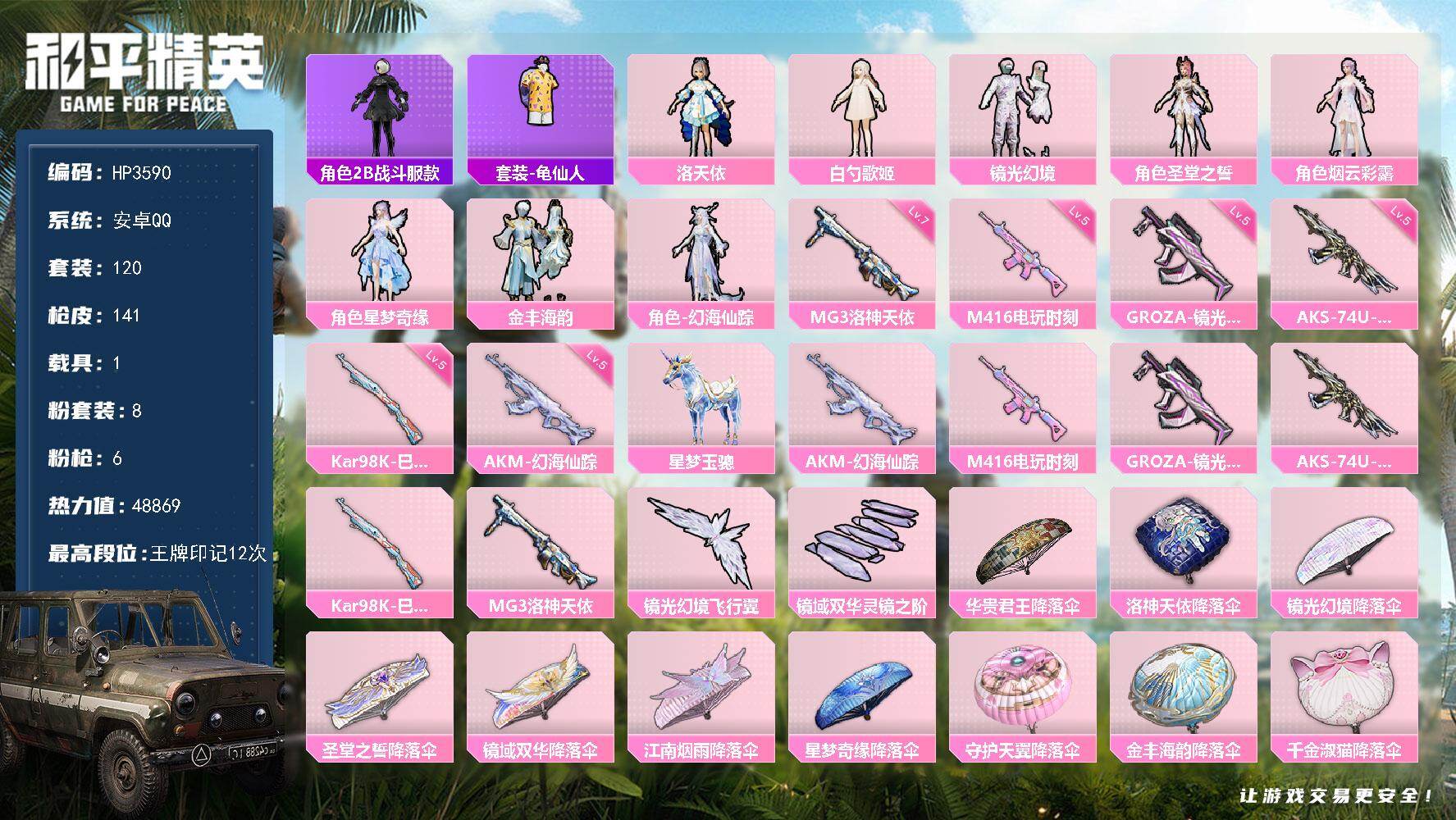 【HP3590】120套装/枪械6/装备189/载具1/战备98/王牌印记12/热力值48869/五级AKM-幻海仙踪/五级M416-电玩时刻/五级GROZA-镜光银凌/五级AKS-74U-信仰神谕/五级Kar98K-巳巳如意/七级MG3-洛神天依/角色-2B战斗服款/套装-龟仙人/角色-洛天依/角色-白勺歌姬/粉装-镜光幻境/角色-圣堂之誓/角色-烟云彩露/角色-星梦奇缘/粉装-金丰海韵/角色-幻海仙踪/星梦玉骢/AKM-幻海仙踪/M416-电玩时刻/GROZA-镜光银凌/AKS-74U-信仰
