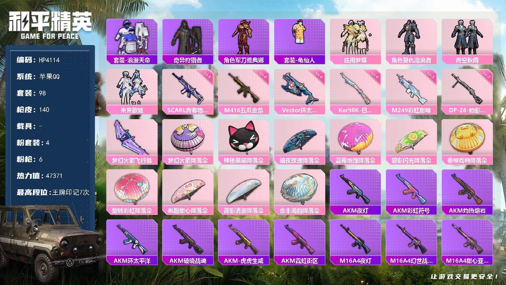 【HP4114】98套装/枪械6/装备178/战备107/王牌印记7/热力值47371/四级SCAR-L-青春物语/四级M416-五爪金龙/四级Vector-环太平洋/四级Kar98K-巳巳如意/三级M249-彩虹甜喵/三级DP-28-豹影疾电/套装-浪漫天命/套装-奇异狩猎者/角色-军刀雅典娜/套装-龟仙人/粉装-庄周梦蝶/角色-复仇流浪者/粉装-青空秋雨/粉装-未来歌姬/SCAR-L-青春物语/M416-五爪金龙/Vector-环太平洋/Kar98K-巳巳如意/M249-彩虹甜喵/DP-28