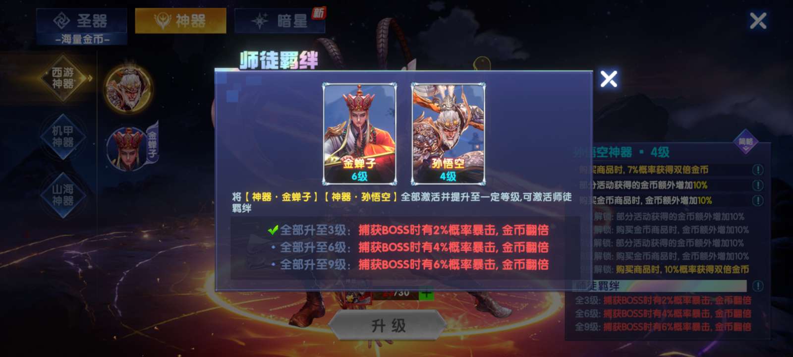 金币加成高,神器碎片差的都不多