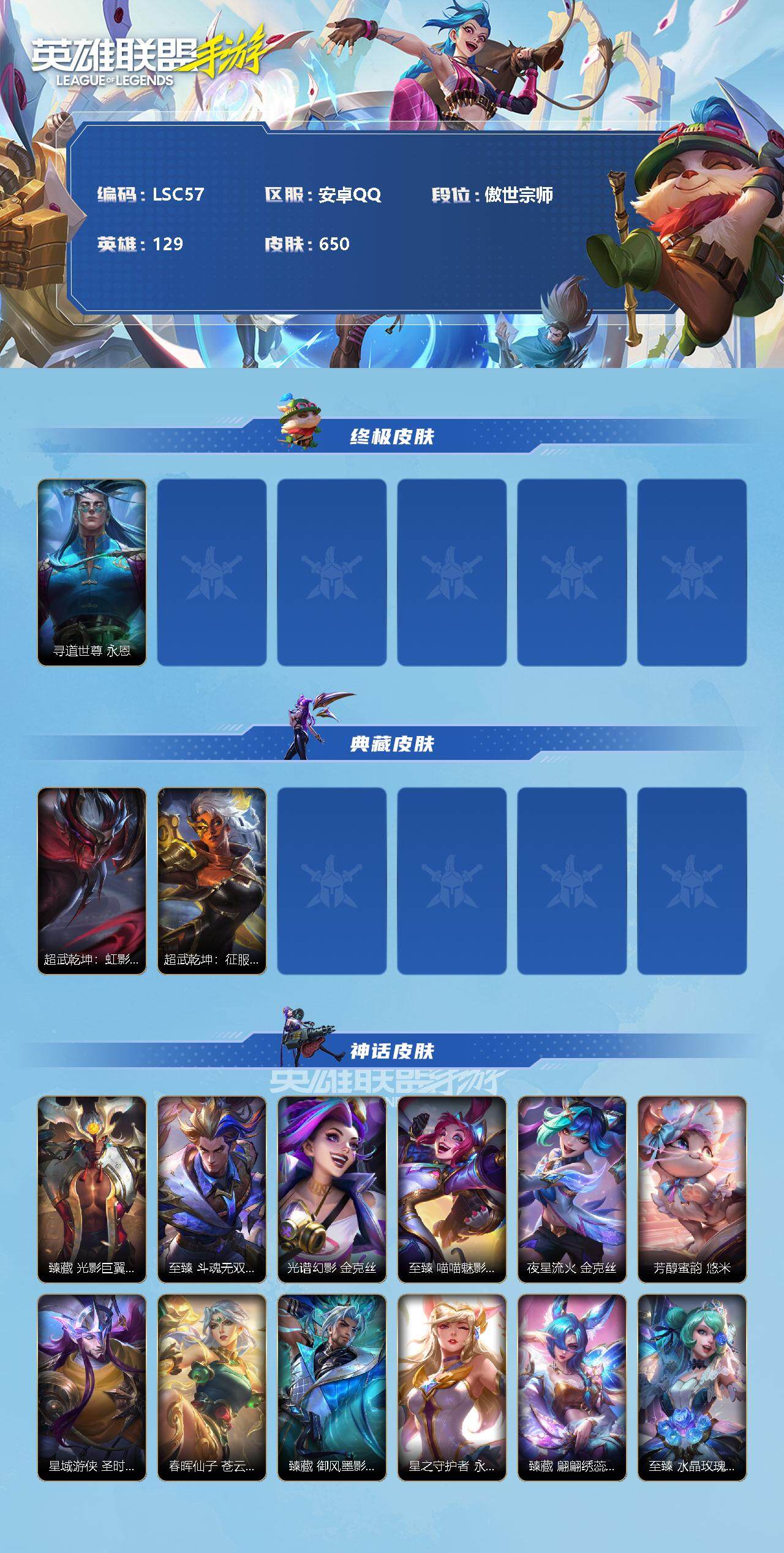 【LSC57】129英雄/650皮肤/2典藏/33神话/86传说/373史诗/傲世宗师/寻道世尊 永恩/超武乾坤劫/超武乾坤莎弥拉/臻藏 光影巨翼 亚托克斯/至臻 斗魂无双 赵信/光谱幻影 金克丝/至臻 喵喵魅影 金克丝/夜星流火 金克丝/芳醇蜜韵 悠米/星域游侠 圣时豪杰 崔斯特/春晖仙子 苍云缥缈 卡莎/臻藏 御风墨影 亚索/星之守护者 永绽盛芒 阿狸/臻藏 翩翩绣蕊 霞/至臻 水晶玫瑰 格温/龙的传人 李青/乘龙破渊 李青/至臻 心之钢 永恩/无与伦比 易/至臻 灵魂莲华 易/玄龙绛天 易
