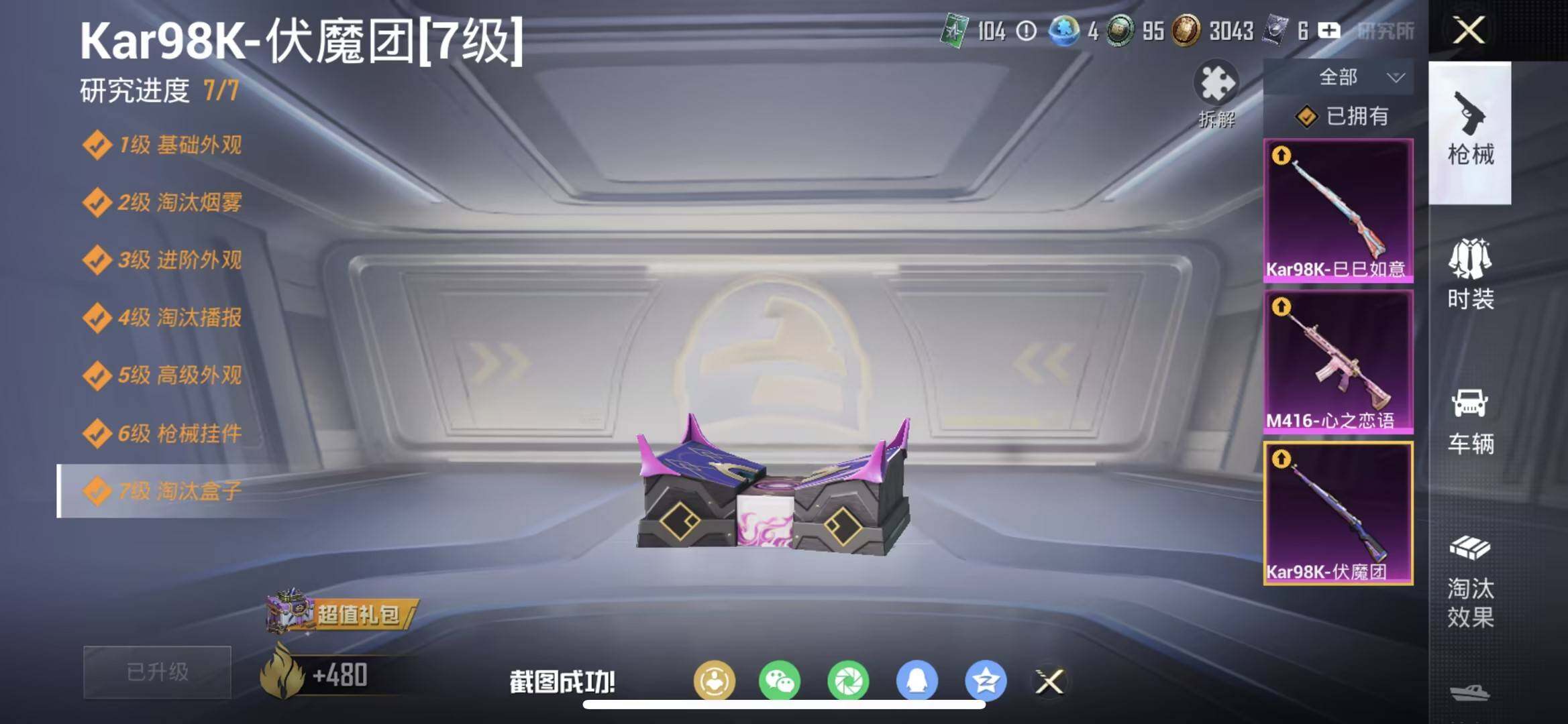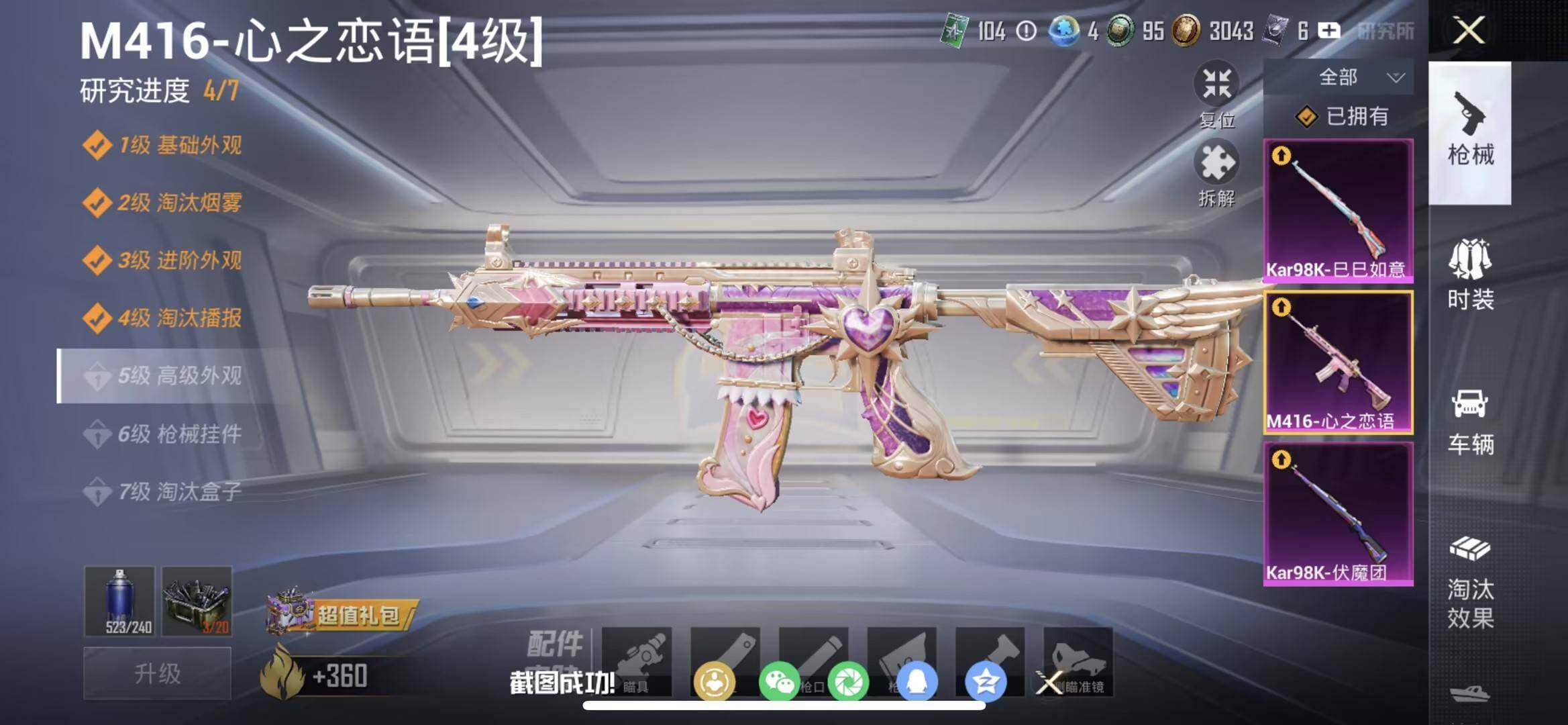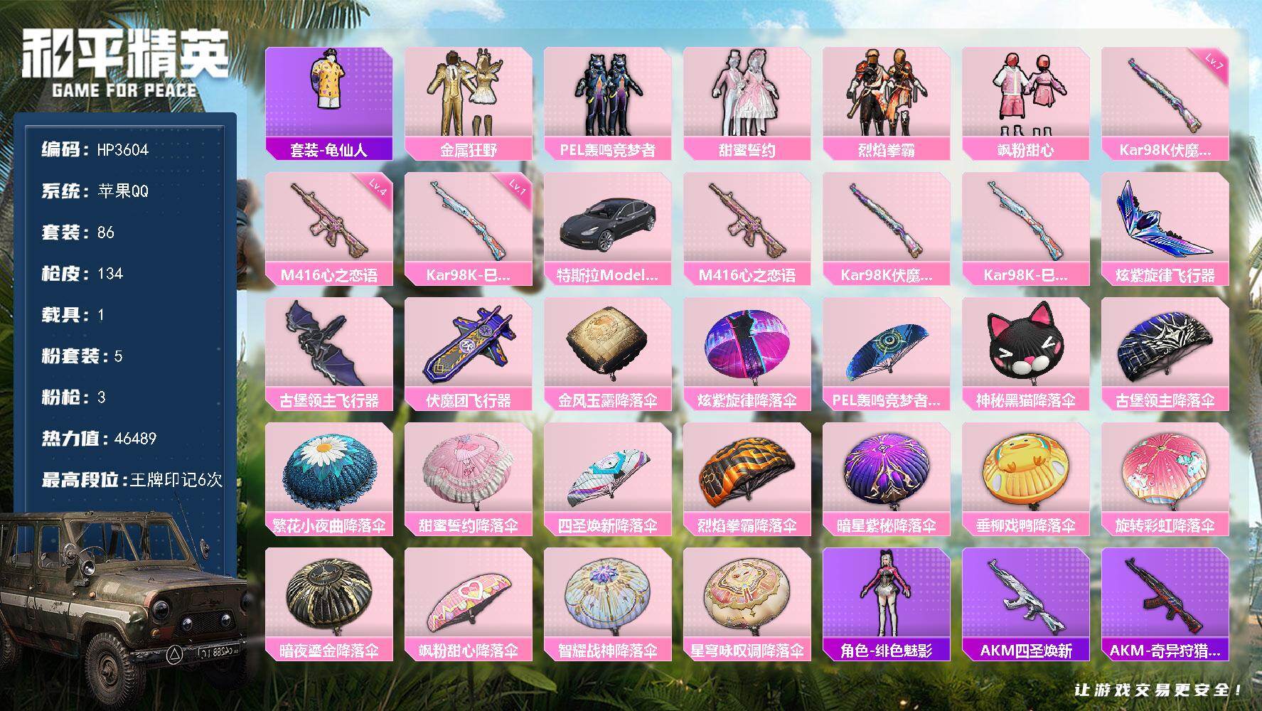 【HP3604】86套装/枪械3/装备131/载具1/战备77/王牌印记6/热力值46489/四级M416-心之恋语/七级Kar98K-伏魔团/一级Kar98K-巳巳如意/套装-龟仙人/粉装-金属狂野/粉装-PEL轰鸣竞梦者/粉装-甜蜜誓约/粉装-烈焰拳霸/粉装-飒粉甜心/特斯拉Model 3(冷光银)/M416-心之恋语/Kar98K-伏魔团/Kar98K-巳巳如意/炫紫旋律飞行器/古堡领主飞行器/伏魔团飞行器/金风玉露降落伞/炫紫旋律降落伞/PEL轰鸣竞梦者降落伞/神秘黑猫降落伞/古堡领主降