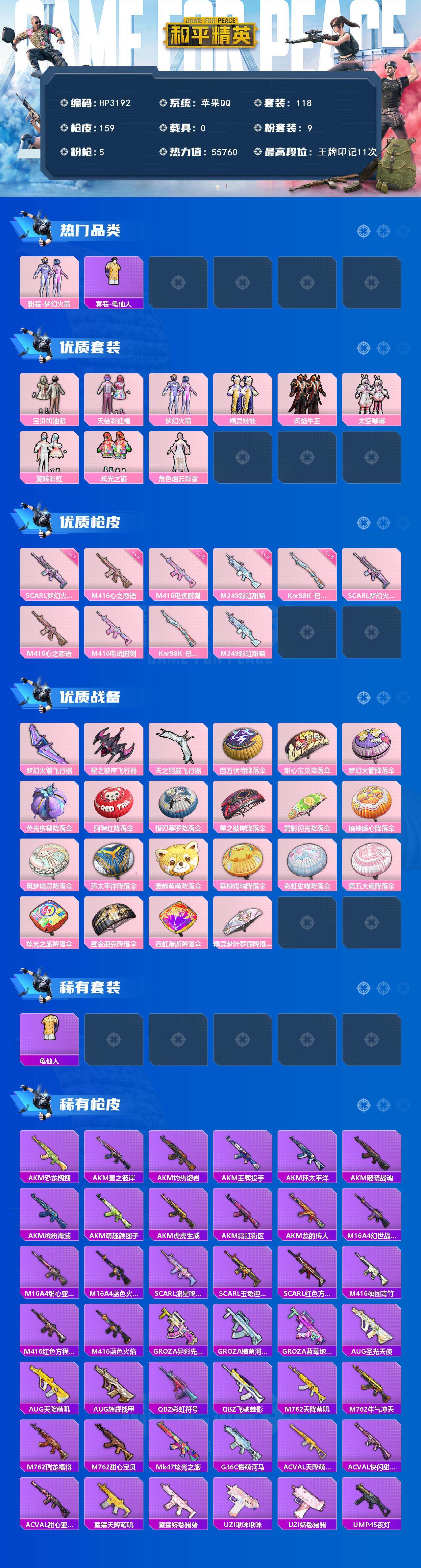 【HP3192】118套装/枪械5/装备200/战备125/王牌印记11/热力值55760/七级SCAR-L-梦幻火箭/六级M416-心之恋语/五级M416-电玩时刻/五级Kar98K-巳巳如意/五级M249-彩虹甜喵/粉装-梦幻火箭/套装-龟仙人/粉装-宝贝奶油派/粉装-天使彩虹糖/粉装-精灵娃娃/粉装-炙焰牛王/粉装-太空嘟嘟/粉装-旋转彩虹/粉装-炫光之旅/角色-烟云彩露/SCAR-L-梦幻火箭/M416-心之恋语/M416-电玩时刻/Kar98K-巳巳如意/M249-彩虹甜喵/梦幻火箭飞