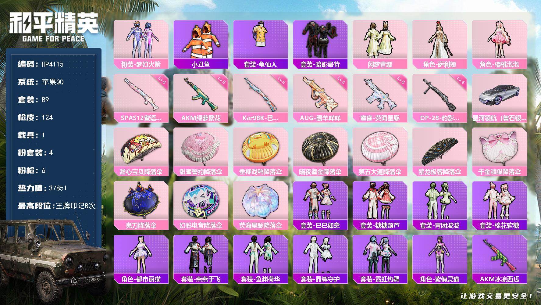 【HP4115】89套装/枪械6/装备142/载具1/战备89/王牌印记8/热力值37851/五级AKM-绿萝繁花/五级AUG-暖羊咩咩/五级蜜獾-荧海星豚/五级Kar98K-巳巳如意/六级SPAS-12-蜜语绒猫/四级DP-28-豹影疾电/粉装-梦幻火箭/套装-小丑鱼/套装-龟仙人/套装-暗影哥特/粉装-闲梦青缨/角色-萨利娅/角色-樱桃泡泡/星河领航(磐石银)/AKM-绿萝繁花/AUG-暖羊咩咩/蜜獾-荧海星豚/Kar98K-巳巳如意/SPAS-12-蜜语绒猫/DP-28-豹影疾电/甜心宝贝