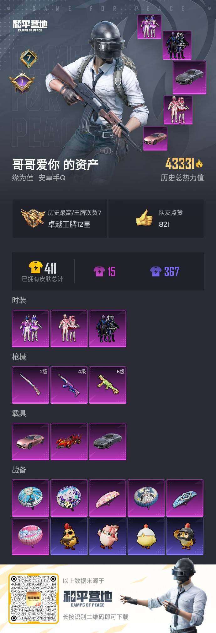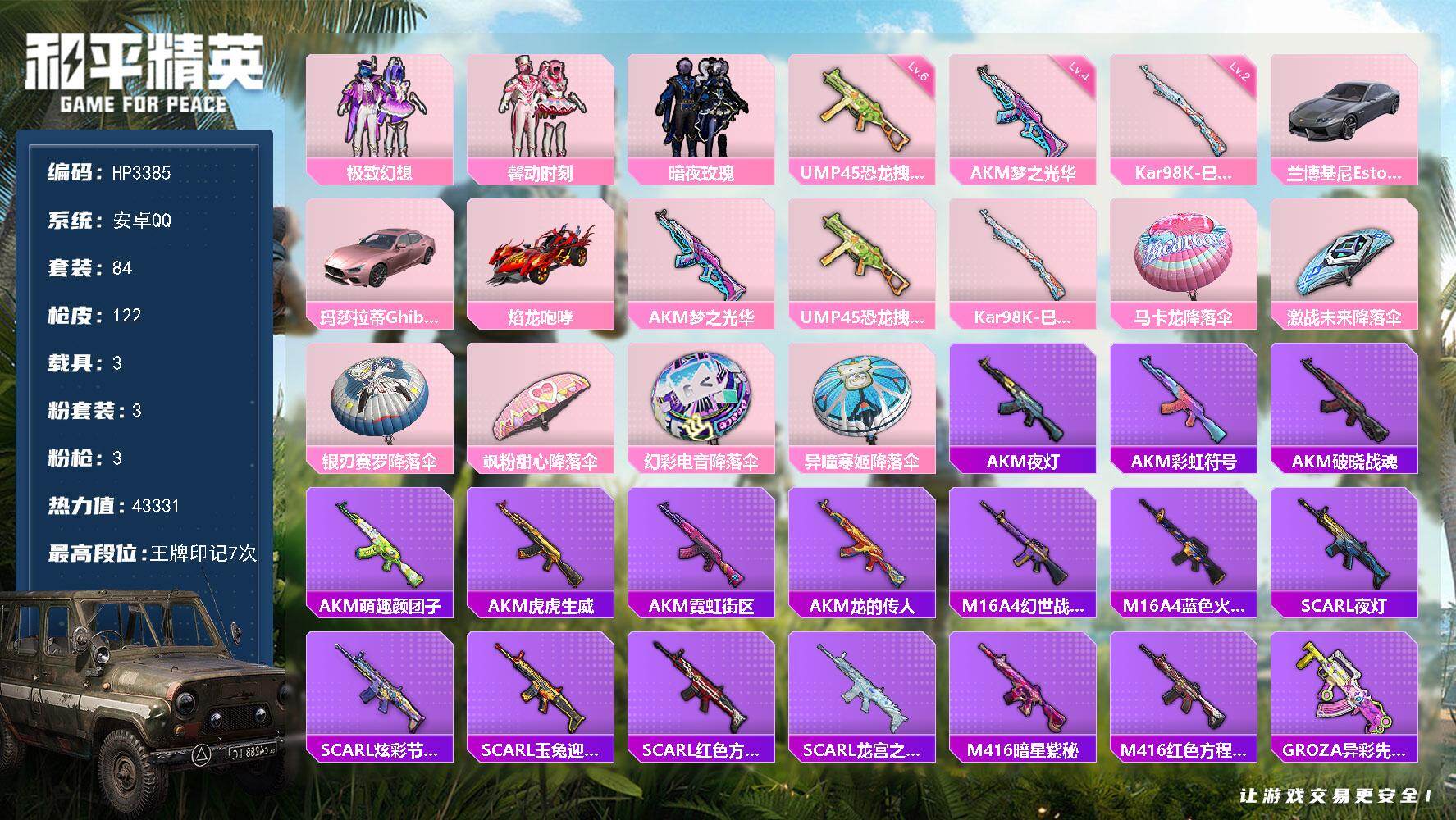 【HP3385】84套装/枪械3/装备129/载具3/战备73/王牌印记7/热力值43331/四级AKM-梦之光华/六级UMP45-恐龙拽拽/二级Kar98K-巳巳如意/粉装-极致幻想/粉装-馨动时刻/粉装-暗夜玫瑰/兰博基尼Estoque(银翼灰)/玛莎拉蒂Ghibli(粉)/焰龙咆哮/AKM-梦之光华/UMP45-恐龙拽拽/Kar98K-巳巳如意/马卡龙降落伞/激战未来降落伞/银刃赛罗降落伞/飒粉甜心降落伞/幻彩电音降落伞/异瞳寒姬降落伞/AKM-夜灯/AKM-彩虹符号/AKM-破晓战魂/A