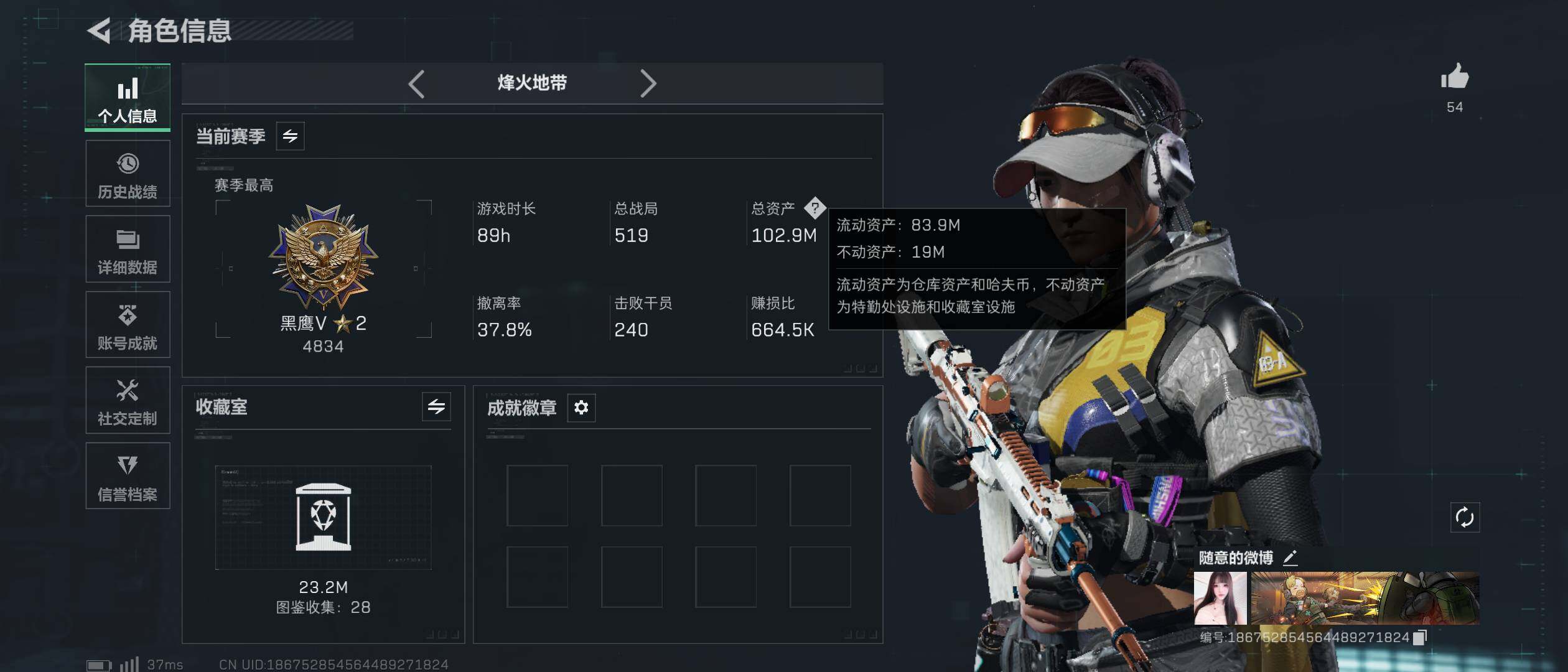 总资产(M):102M/哈夫币(K):15856K/ 传说枪皮数:14/全面战场等级:4_段位:无段位/烽火地带等级:60_段位:黑鹰/