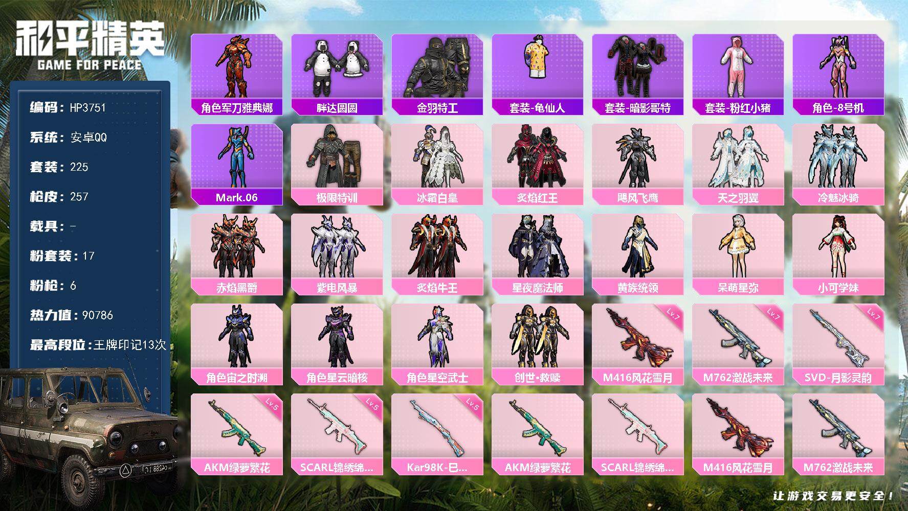 【HP3751】225套装/枪械6/装备339/战备199/王牌印记13/热力值90786/五级AKM-绿萝繁花/五级SCAR-L-锦绣绵绵/七级M416-风花雪月/七级M762-激战未来/五级Kar98K-巳巳如意/七级SVD-月影灵韵/角色-军刀雅典娜/套装-胖达圆圆/套装-金羽特工/套装-龟仙人/套装-暗影哥特/套装-粉红小猪/角色-8号机/角色-Mark.06/粉装-极限特训/粉装-冰霜白皇/粉装-炙焰红王/粉装-飓风飞鹰/粉装-天之羽翼/粉装-冷魅冰骑/粉装-赤焰黑爵/粉装-紫电风暴/