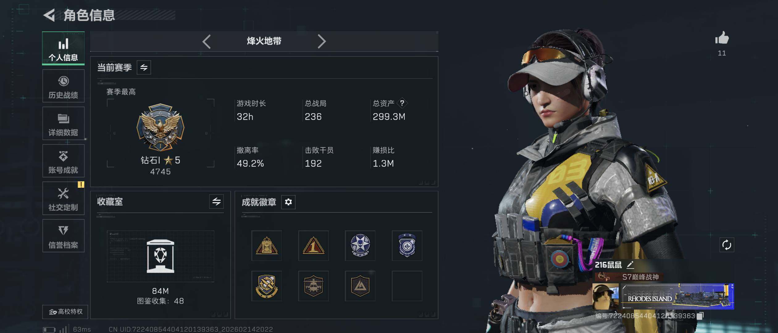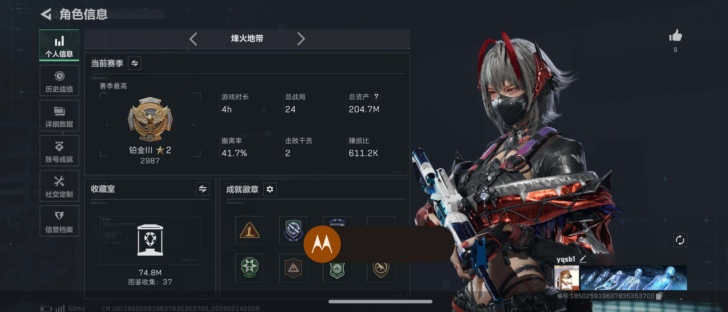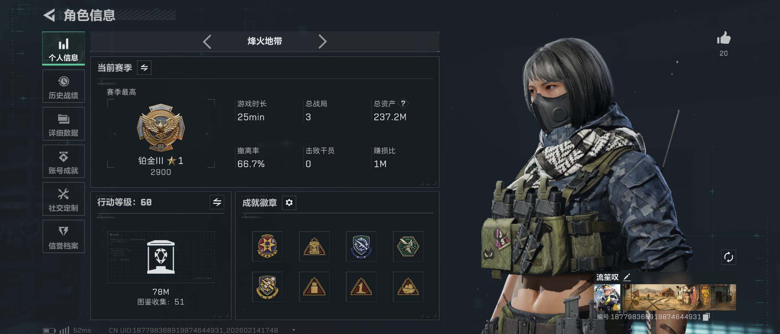 【SJZ266】总资产(M):299M/哈夫币(K):64555K/哈夫币(K):64555K/传说枪皮数:15/全面战场等级:29_段位:上等兵/烽火地带等级:60_段位:钻石/红狼-电锯惊魂/露娜-金牌射手/近战-信条/近战-黑鹰/ASh-12战斗步枪-鹅鸭杀/SG552突击步枪-运动员/SCAR-H战斗步枪-启航/腾龙突击步枪-捞点薯条/KC17突击步枪-电锯惊魂/P90冲锋枪-信条/Vector冲锋枪-能天使-午夜邮差/勇士冲锋枪-能天使-午夜邮差/QCQ171冲锋枪-鹅鸭杀/QJB20