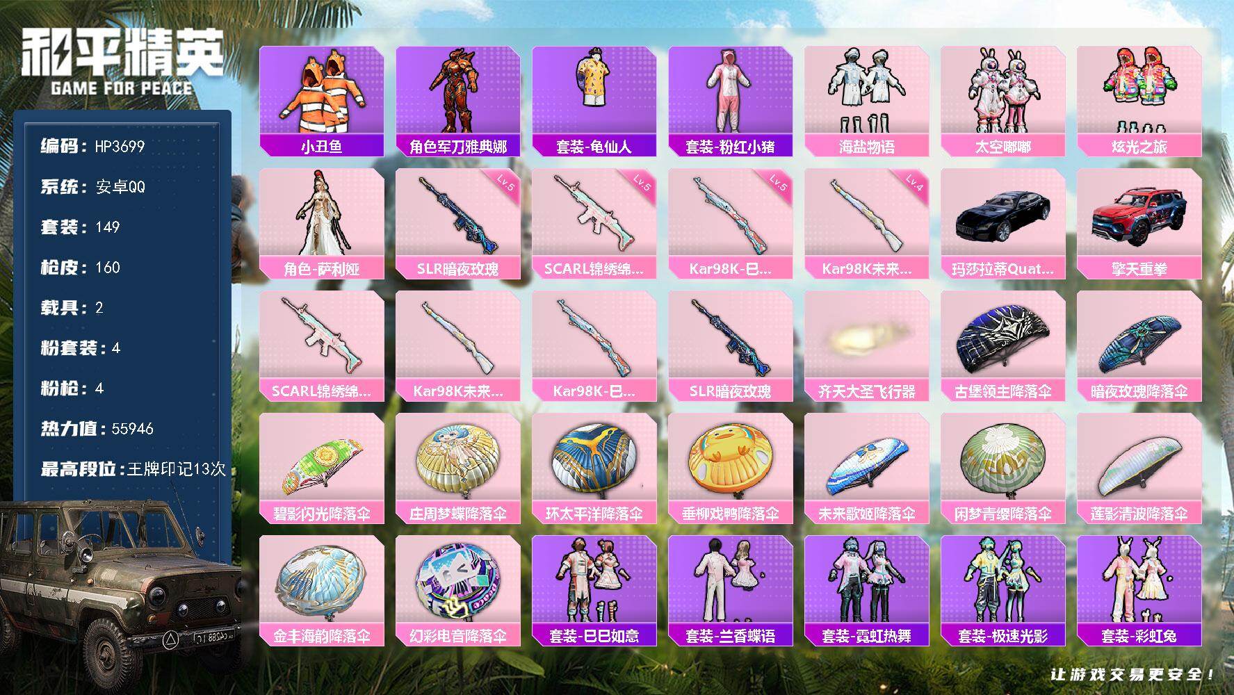 【HP3699】149套装/枪械4/装备193/载具2/战备137/王牌印记13/热力值55946/五级SCAR-L-锦绣绵绵/四级Kar98K-未来歌姬/五级Kar98K-巳巳如意/五级SLR-暗夜玫瑰/套装-小丑鱼/角色-军刀雅典娜/套装-龟仙人/套装-粉红小猪/粉装-海盐物语/粉装-太空嘟嘟/粉装-炫光之旅/角色-萨利娅/玛莎拉蒂Quattroporte(夜幕蓝)/擎天重拳/SCAR-L-锦绣绵绵/Kar98K-未来歌姬/Kar98K-巳巳如意/SLR-暗夜玫瑰/齐天大圣飞行器/古堡领主降