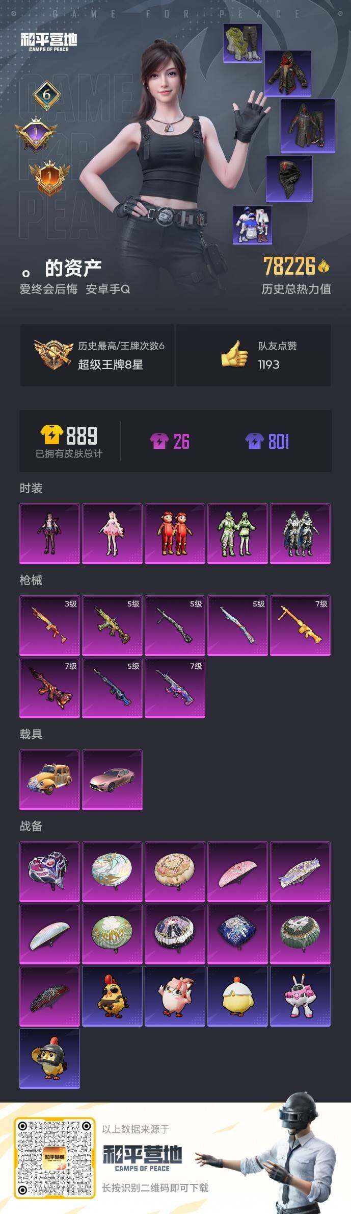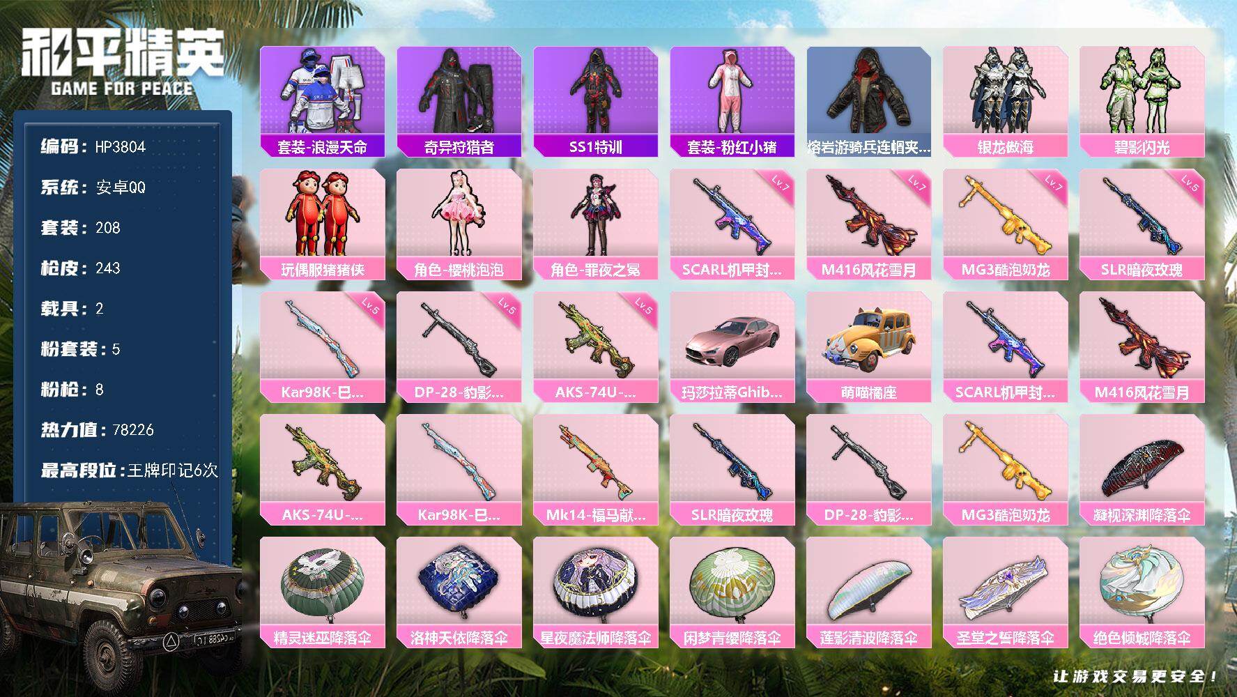 【HP3804】208套装/枪械8/装备278/载具2/战备158/王牌印记6/热力值78226/七级SCAR-L-机甲封神/七级M416-风花雪月/五级AKS-74U-森灵之息/五级Kar98K-巳巳如意/五级SLR-暗夜玫瑰/五级DP-28-豹影疾电/七级MG3-酷泡奶龙/套装-浪漫天命/套装-奇异狩猎者/套装-SS1特训/套装-粉红小猪/熔岩游骑兵连帽夹克/粉装-银龙傲海/粉装-碧影闪光/玩偶服-猪猪侠/角色-樱桃泡泡/角色-罪夜之冕/玛莎拉蒂Ghibli(粉)/萌喵橘座/SCAR-L-机