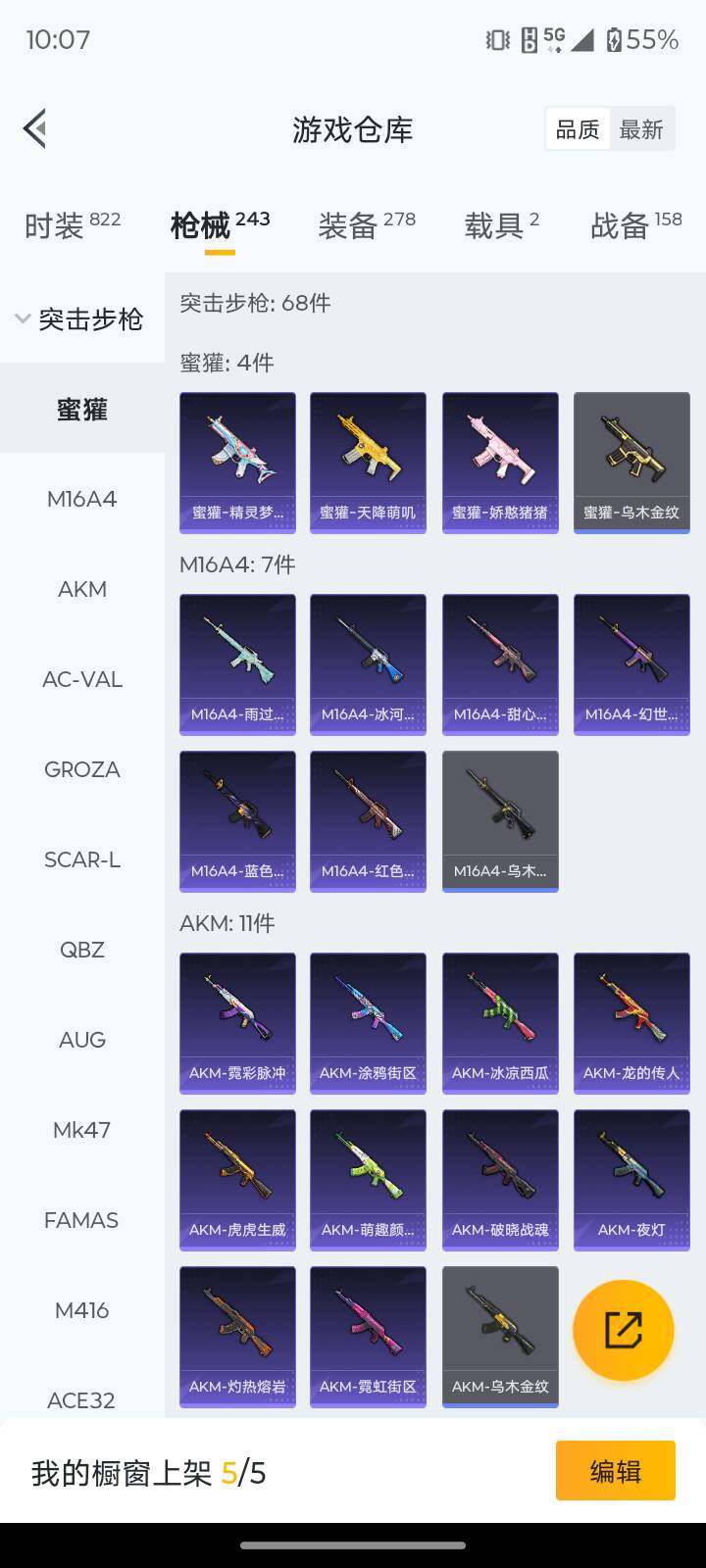 208套装/枪械8/装备278/载具2/战备158/王牌印记6/