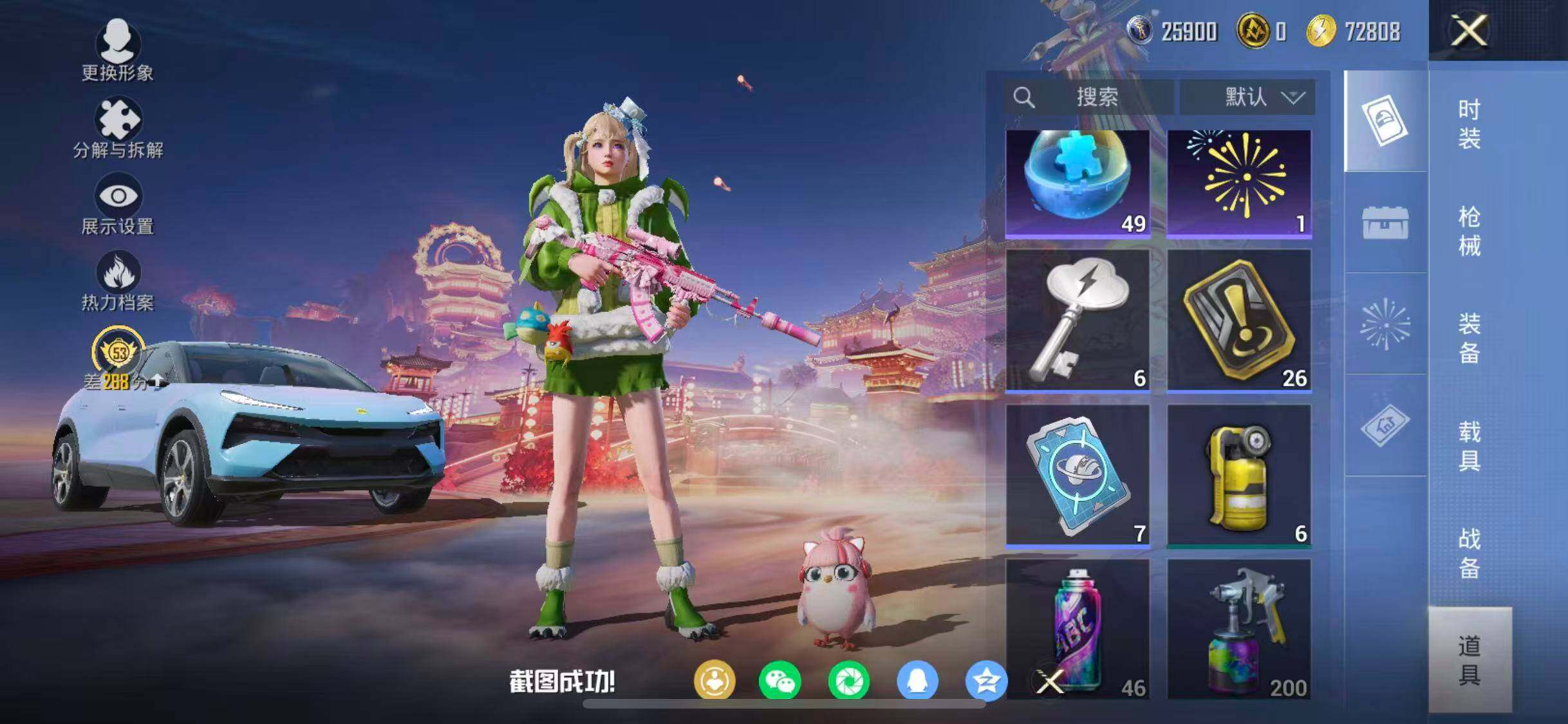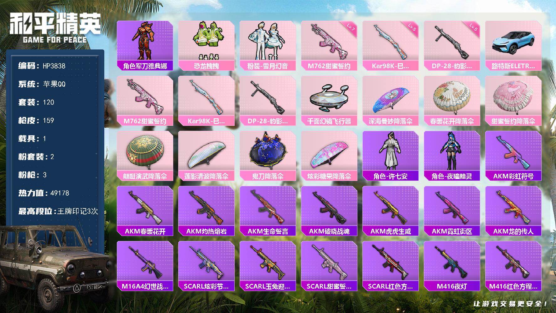 【HP3838】120套装/枪械3/装备195/载具1/战备104/王牌印记3/热力值49178/七级M762-甜蜜誓约/五级Kar98K-巳巳如意/五级DP-28-豹影疾电/角色-军刀雅典娜/粉装-恐龙拽拽/粉装-雪月幻音/路特斯ELETRE(冰川蓝)/M762-甜蜜誓约/Kar98K-巳巳如意/DP-28-豹影疾电/千面幻镜飞行器/深海曼妙降落伞/春暖花开降落伞/甜蜜誓约降落伞/翩跹演武降落伞/莲影清波降落伞/鬼刀降落伞/炫彩糖果降落伞/角色-许七安/角色-夜瞳黯灵/AKM-彩虹符号/AKM