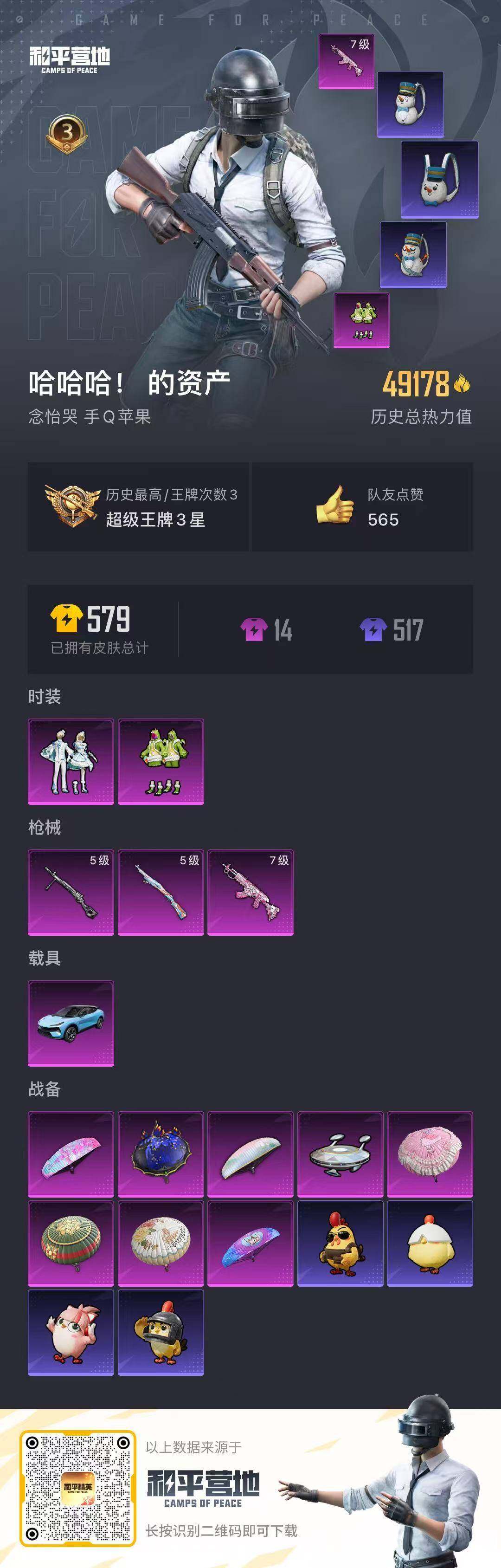 120套装/枪械3/装备195/载具1/战备104/王牌印记3/热力值49178/