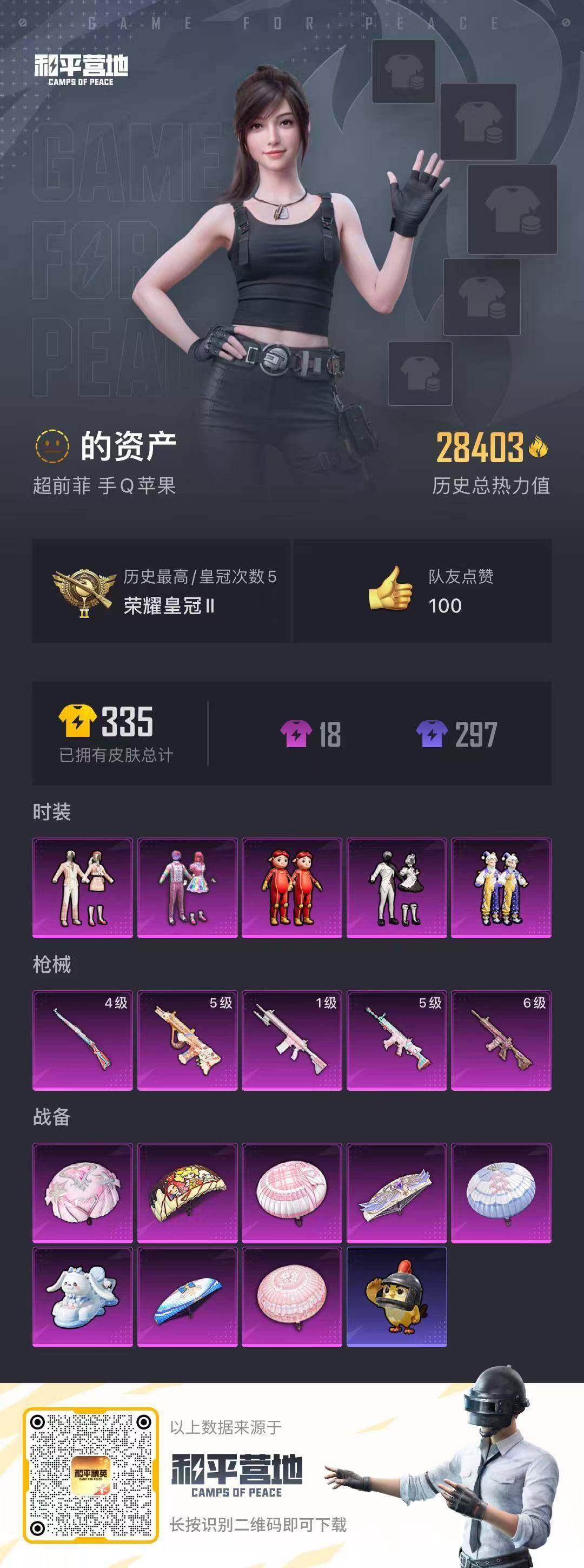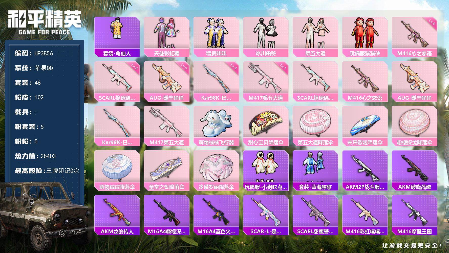 【HP3856】48套装/枪械5/装备125/战备60/热力值28403/五级SCAR-L-锦绣绵绵/六级M416-心之恋语/五级AUG-暖羊咩咩/四级Kar98K-巳巳如意/一级M417-第五大道/套装-龟仙人/粉装-天使彩虹糖/粉装-精灵娃娃/粉装-冰川幽秘/粉装-第五大道/玩偶服-猪猪侠/SCAR-L-锦绣绵绵/M416-心之恋语/AUG-暖羊咩咩/Kar98K-巳巳如意/M417-第五大道/萌物绒绒飞行器/甜心宝贝降落伞/第五大道降落伞/未来歌姬降落伞/粉樱探戈降落伞/萌物绒绒降落伞/圣