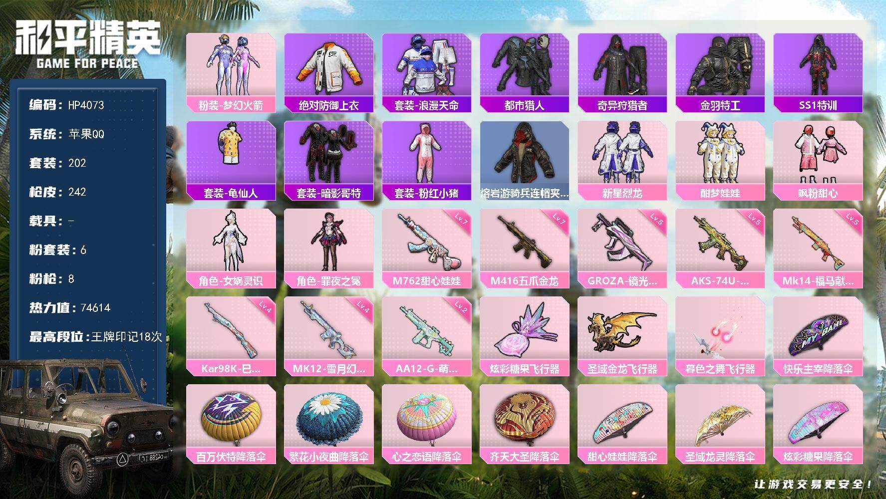 【HP4073】202套装/枪械8/装备260/战备185/王牌印记18/热力值74614/七级M416-五爪金龙/五级GROZA-镜光银凌/七级M762-甜心娃娃/五级AKS-74U-森灵之息/四级Kar98K-巳巳如意/五级Mk14-福马献瑞/四级MK12-雪月幻音/二级AA12-G-萌骑幻想/粉装-梦幻火箭/绝对防御上衣/套装-浪漫天命/套装-都市猎人/套装-奇异狩猎者/套装-金羽特工/套装-SS1特训/套装-龟仙人/套装-暗影哥特/套装-粉红小猪/熔岩游骑兵连帽夹克/粉装-新星烈龙/粉装