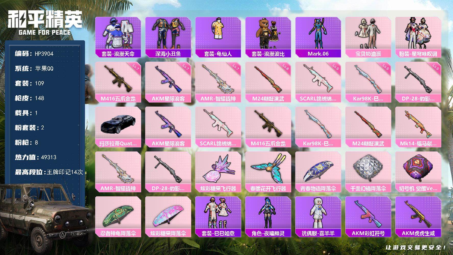 【HP3904】109套装/枪械8/装备171/载具1/战备108/王牌印记14/热力值49313/七级AKM-星际浪客/五级SCAR-L-锦绣绵绵/七级M416-五爪金龙/五级Kar98K-巳巳如意/六级M24-翩跹演武/七级AMR-智耀战神/五级DP-28-豹影疾电/套装-浪漫天命/套装-深海小丑鱼/套装-龟仙人/套装-浪漫波比/角色-Mark.06/粉装-宝贝奶油派/粉装-星穹咏叹调/玛莎拉蒂Quattroporte(夜幕蓝)/AKM-星际浪客/SCAR-L-锦绣绵绵/M416-五爪金龙/