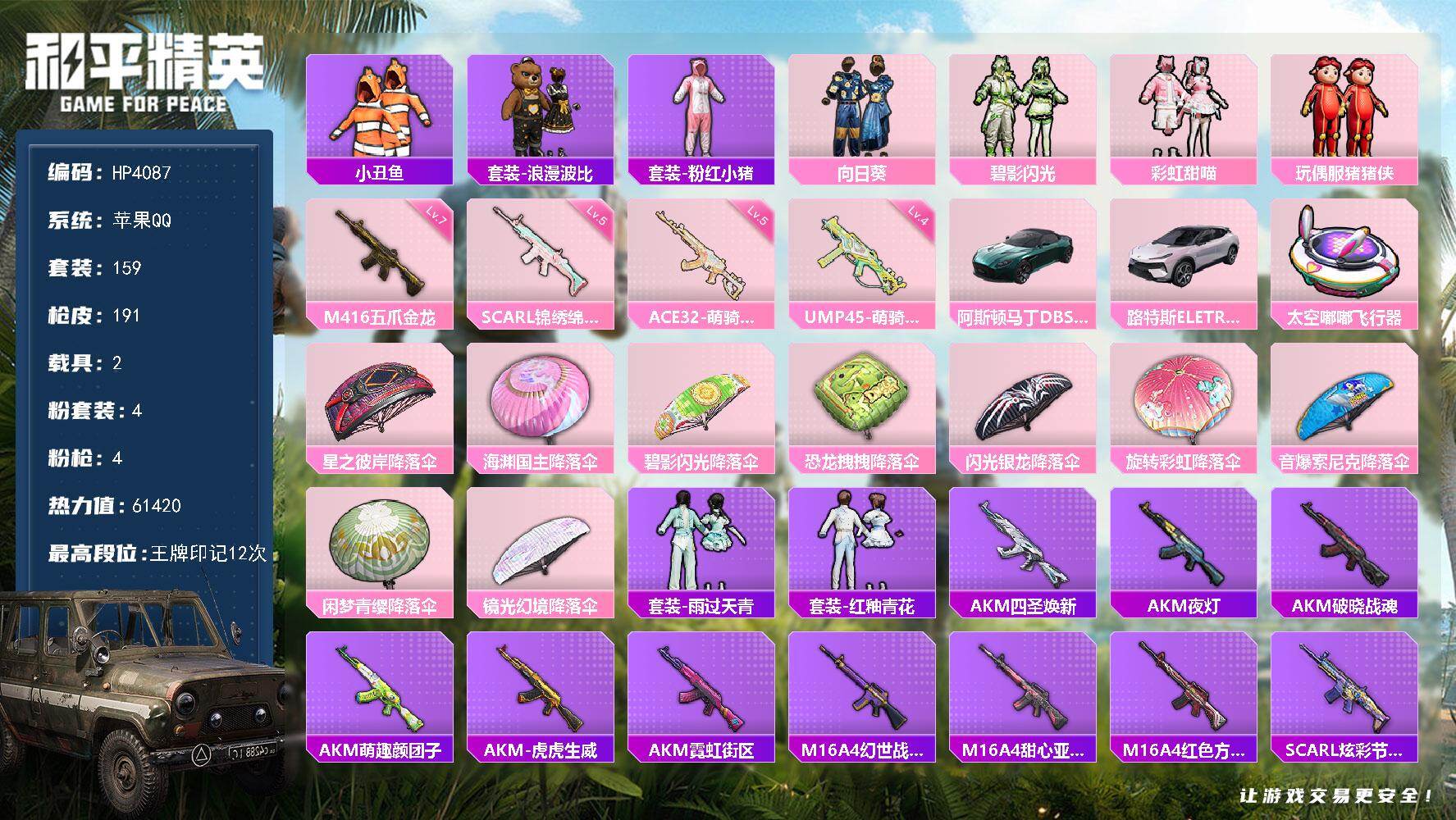 【HP4087】159套装/枪械4/装备209/载具2/战备143/王牌印记12/热力值61420/五级SCAR-L-锦绣绵绵/七级M416-五爪金龙/五级ACE32-萌骑漫游/四级UMP45-萌骑冒险/套装-小丑鱼/套装-浪漫波比/套装-粉红小猪/粉装-向日葵/粉装-碧影闪光/粉装-彩虹甜喵/玩偶服-猪猪侠/阿斯顿马丁DBS(绿)/路特斯ELETRE(花绽灰)/SCAR-L-锦绣绵绵/M416-五爪金龙/ACE32-萌骑漫游/UMP45-萌骑冒险/太空嘟嘟飞行器/星之彼岸降落伞/海渊国主降落伞