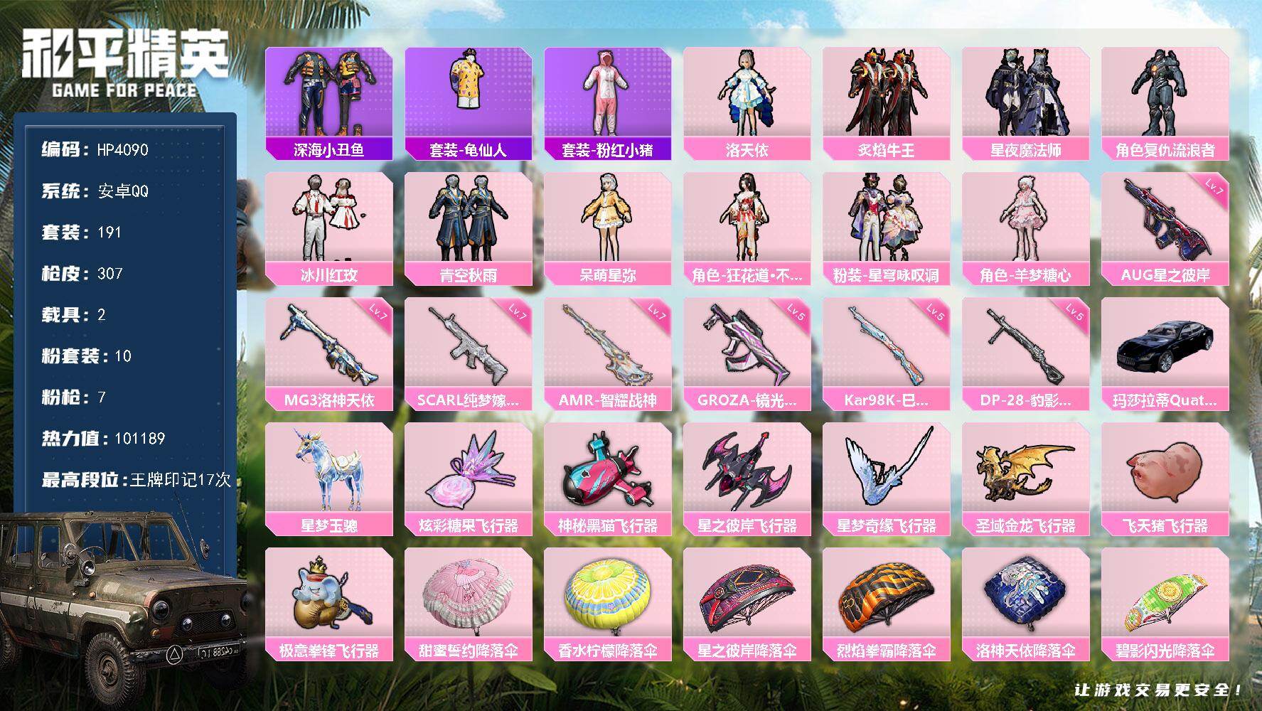【HP4090】191套装/枪械7/装备428/载具2/战备217/王牌印记17/热力值101189/七级SCAR-L-纯梦嫁纱/五级GROZA-镜光银凌/七级AUG-星之彼岸/五级Kar98K-巳巳如意/七级AMR-智耀战神/五级DP-28-豹影疾电/七级MG3-洛神天依/套装-深海小丑鱼/套装-龟仙人/套装-粉红小猪/角色-洛天依/粉装-炙焰牛王/粉装-星夜魔法师/角色-复仇流浪者/粉装-冰川红玫/粉装-青空秋雨/角色-呆萌星弥/角色-狂花道·不知火舞/粉装-星穹咏叹调/角色-羊梦糖心/玛莎