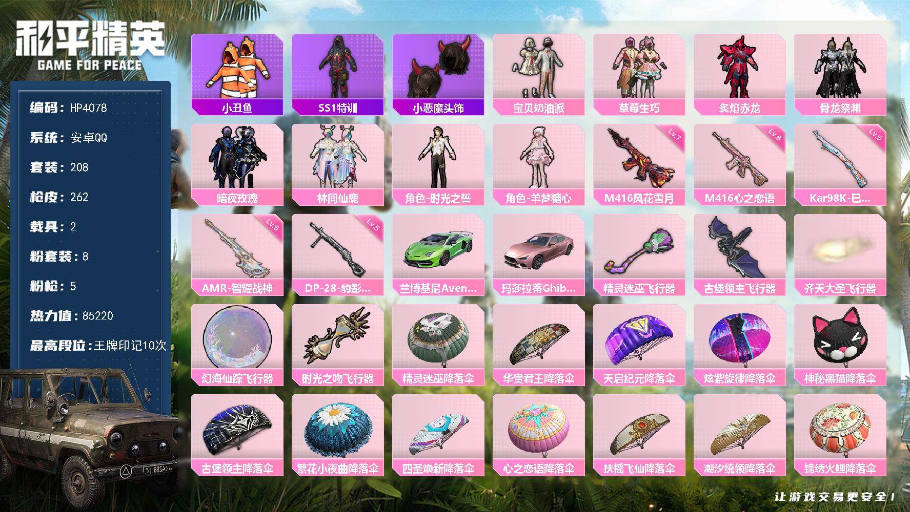 【HP4078】208套装/枪械5/装备320/载具2/战备196/王牌印记10/热力值85220/六级M416-心之恋语/七级M416-风花雪月/五级Kar98K-巳巳如意/五级AMR-智耀战神/五级DP-28-豹影疾电/套装-小丑鱼/套装-SS1特训/小恶魔头饰/粉装-宝贝奶油派/粉装-草莓生巧/粉装-炙焰赤龙/粉装-骨龙祭渊/粉装-暗夜玫瑰/粉装-林间仙鹿/角色-时光之誓/角色-羊梦糖心/兰博基尼Aventador SVJ(翡翠绿)/玛莎拉蒂Ghibli(粉)/M416-心之恋语/M416