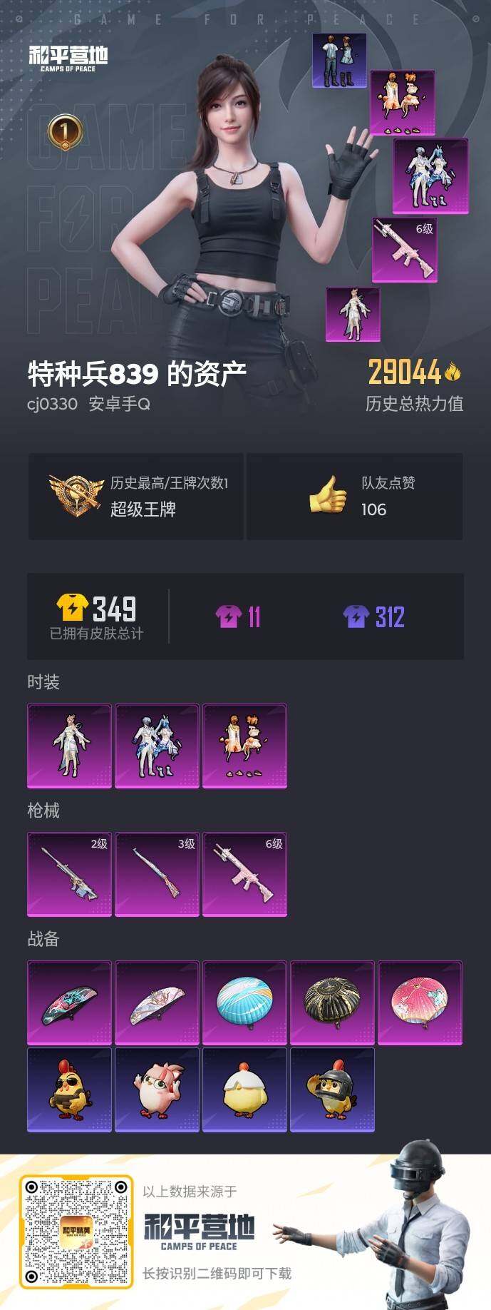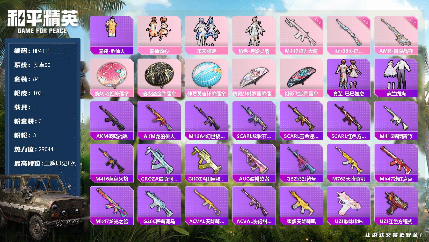 【HP4111】84套装/枪械3/装备85/战备77/王牌印记1/热力值29044/三级Kar98K-巳巳如意/二级AMR-智耀战神/六级M417-第五大道/套装-龟仙人/粉装-橘柚倾心/粉装-未来歌姬/角色-月影灵韵/Kar98K-巳巳如意/AMR-智耀战神/M417-第五大道/旋转彩虹降落伞/暗夜鎏金降落伞/仲夏莫吉托降落伞/精灵梦叶罗丽降落伞/幻影飞狐降落伞/套装-巳巳如意/套装-萝兰蝴蝶/AKM-破晓战魂/AKM-龙的传人/M16A4-幻世战舞者/SCAR-L-炫彩节奏/SCAR-L-玉