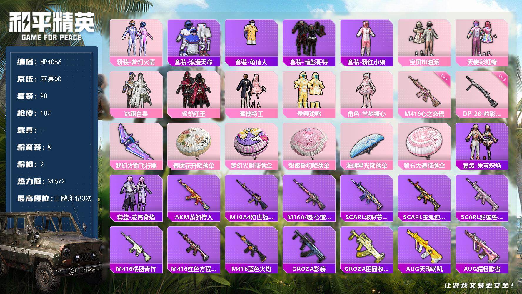 【HP4086】98套装/枪械2/装备95/战备74/王牌印记3/热力值31672/七级M416-心之恋语/三级DP-28-豹影疾电/粉装-梦幻火箭/套装-浪漫天命/套装-龟仙人/套装-暗影哥特/套装-粉红小猪/粉装-宝贝奶油派/粉装-天使彩虹糖/粉装-冰霜白皇/粉装-炙焰红王/粉装-蜜桃特工/粉装-垂柳戏鸭/角色-羊梦糖心/M416-心之恋语/DP-28-豹影疾电/梦幻火箭飞行器/春暖花开降落伞/梦幻火箭降落伞/甜蜜誓约降落伞/海螺星光降落伞/第五大道降落伞/套装-朱霞炽焰/套装-凌霄紫焰/A