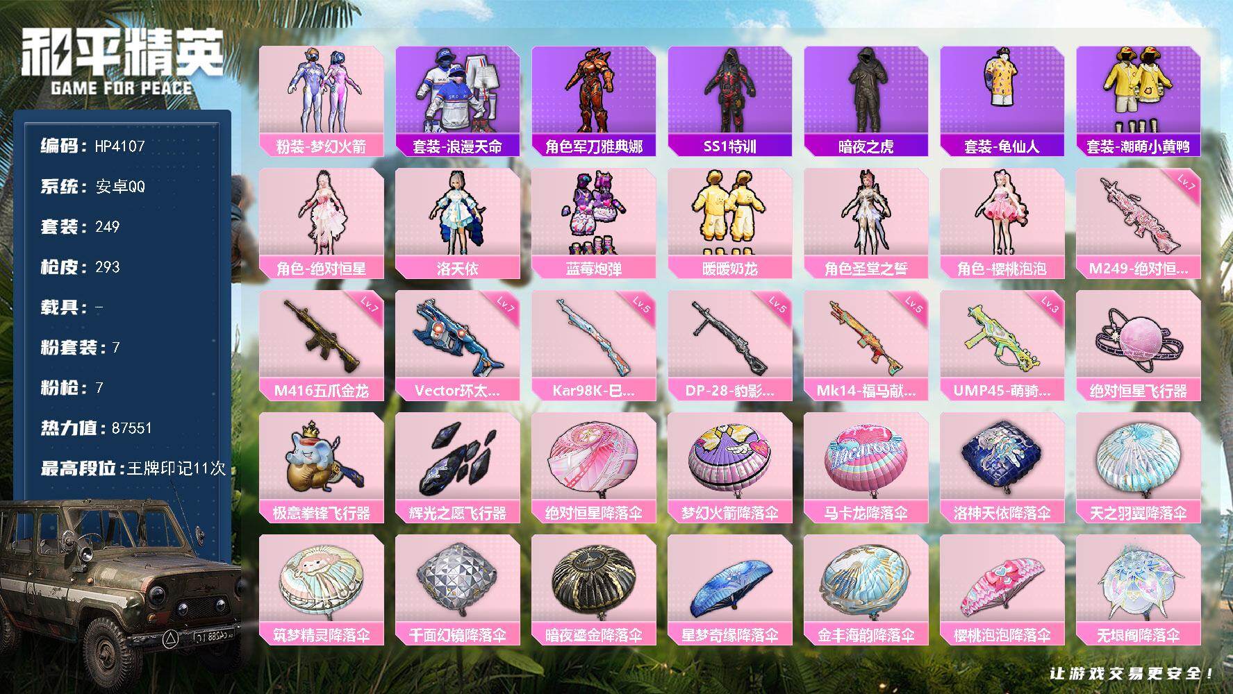 【HP4107】249套装/枪械7/装备309/战备210/王牌印记11/热力值87551/七级M416-五爪金龙/三级UMP45-萌骑冒险/七级Vector-环太平洋/五级Kar98K-巳巳如意/五级Mk14-福马献瑞/七级M249-绝对恒星/五级DP-28-豹影疾电/粉装-梦幻火箭/套装-浪漫天命/角色-军刀雅典娜/套装-SS1特训/套装-暗夜之虎/套装-龟仙人/套装-潮萌小黄鸭/角色-绝对恒星/角色-洛天依/粉装-蓝莓炮弹/粉装-暖暖奶龙/角色-圣堂之誓/角色-樱桃泡泡/M416-五爪金龙