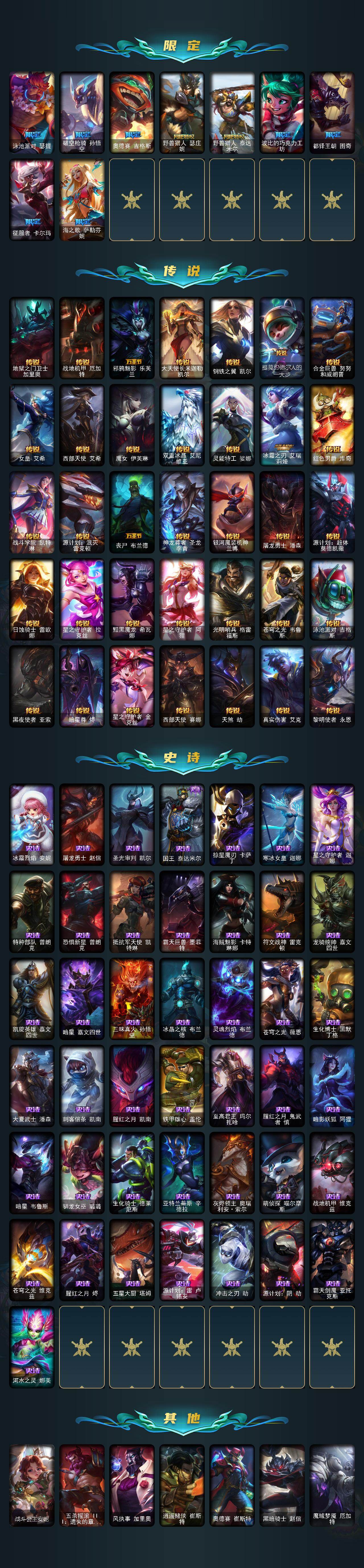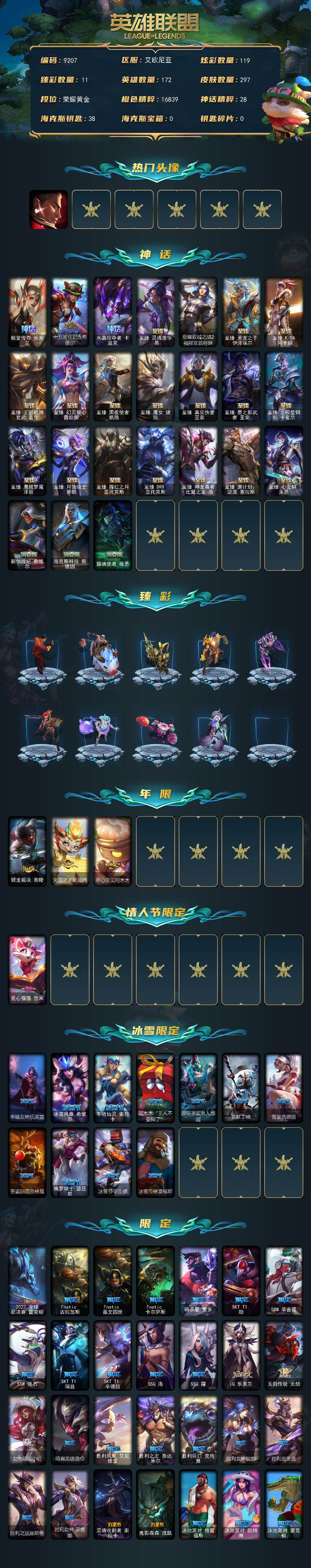 黄金段位-172英雄-297皮肤-119炫彩-0终极-24神话-53限定-35传说-43史诗
