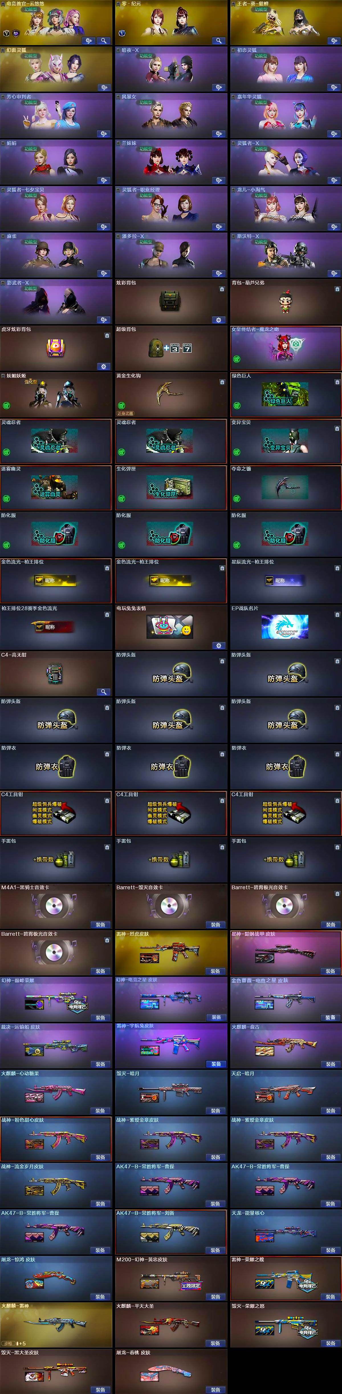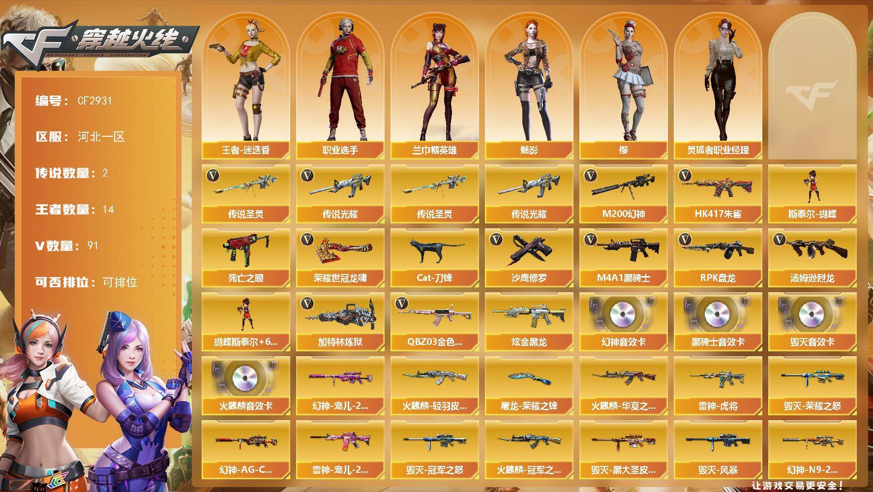 【热门武器】:QBZ03-金色蔷薇,HK417-朱雀,M4A1-青龙,M200-幻神,M200-竞技荣光,死亡之眼,荣耀世冠-雷神,白虎-电玩蓝兔,Kar98K-星神,金色小号,毒蜂,M4A1-黑骑士,汤姆逊-烈龙*2,RPK-盘龙*2,加特林-炼狱,斯泰尔-蝴蝶,裁决-雪莉杨,COP-白鲨,USP-雷暴,沙鹰-修罗*2,荣耀世冠-龙啸