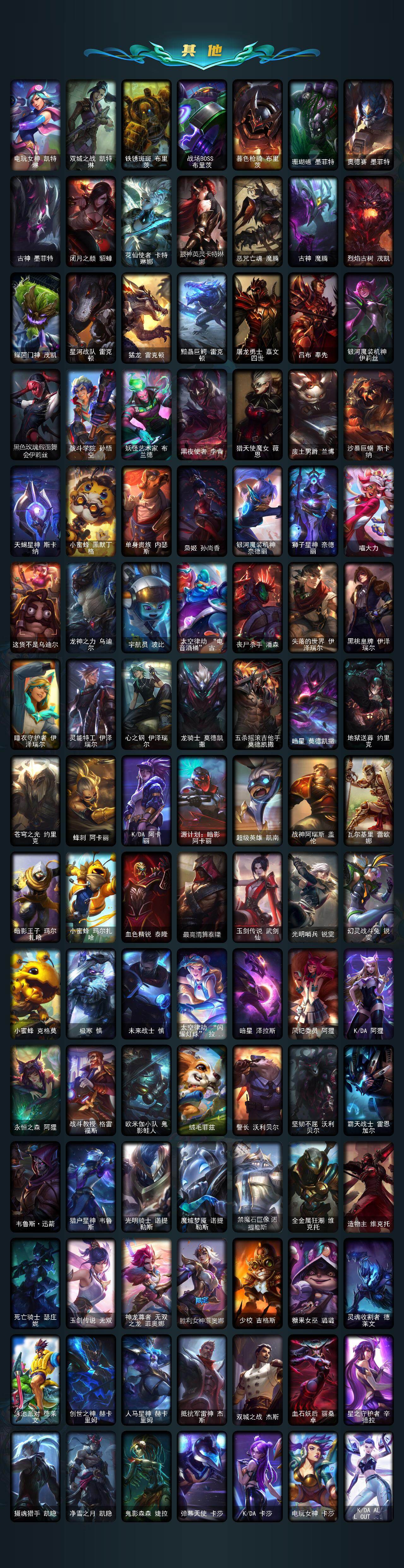 【至臻皮肤】:至臻魔女乐芙兰,至臻星之守护者索拉卡,至臻魅惑女巫厄运小姐,至臻海珀利安小队X09星环灵风迦娜,至臻暗星墨菲特,至臻黑色玫瑰假面舞会卡特琳娜,至臻焰执事布兰德,至臻烈焰美人薇恩,至臻飞升战神潘森,至臻灵能特工伊泽瑞尔,至臻战斗学院蕾欧娜,至臻西部魔影猎天使恶魔泰隆,至臻青花瓷拉克
