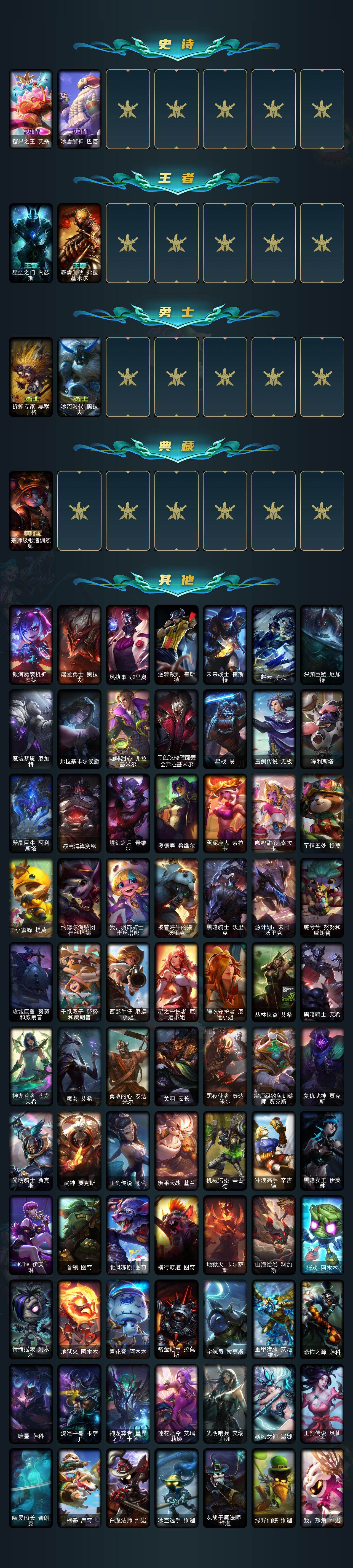 黄金段位-172英雄-510皮肤-213炫彩-3终极-44神话-83限定-55传说-93史诗