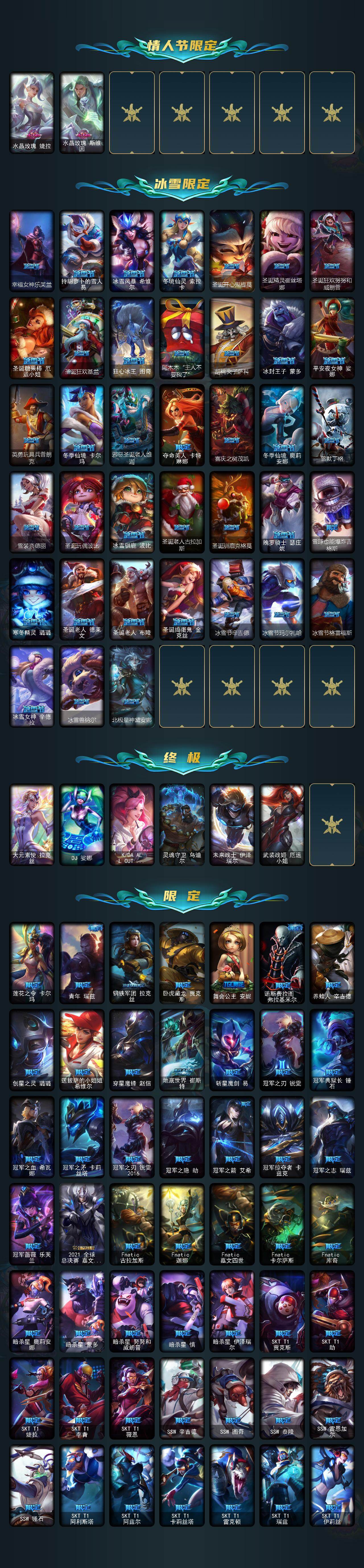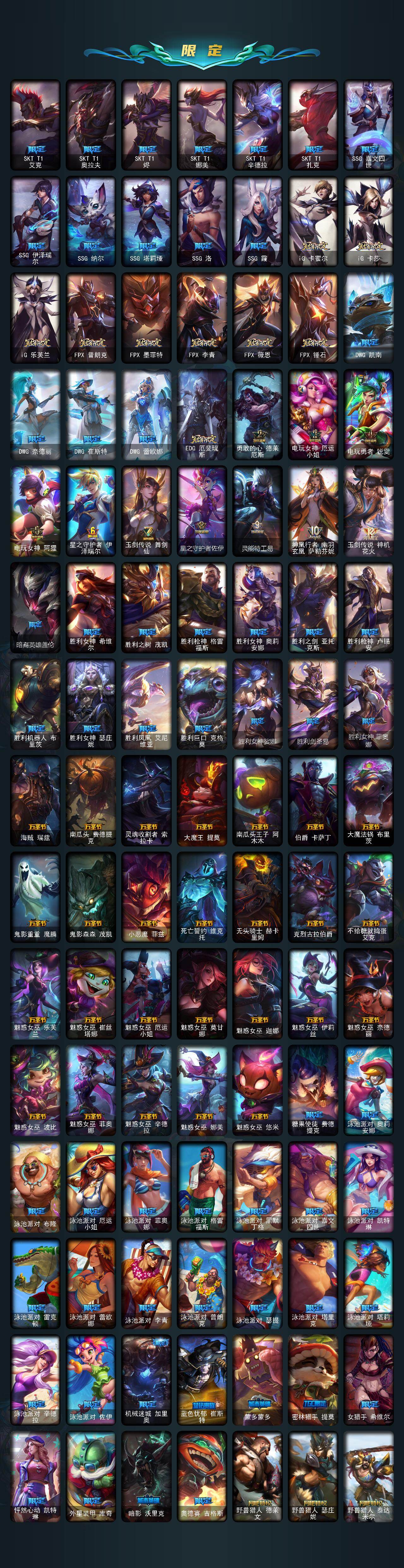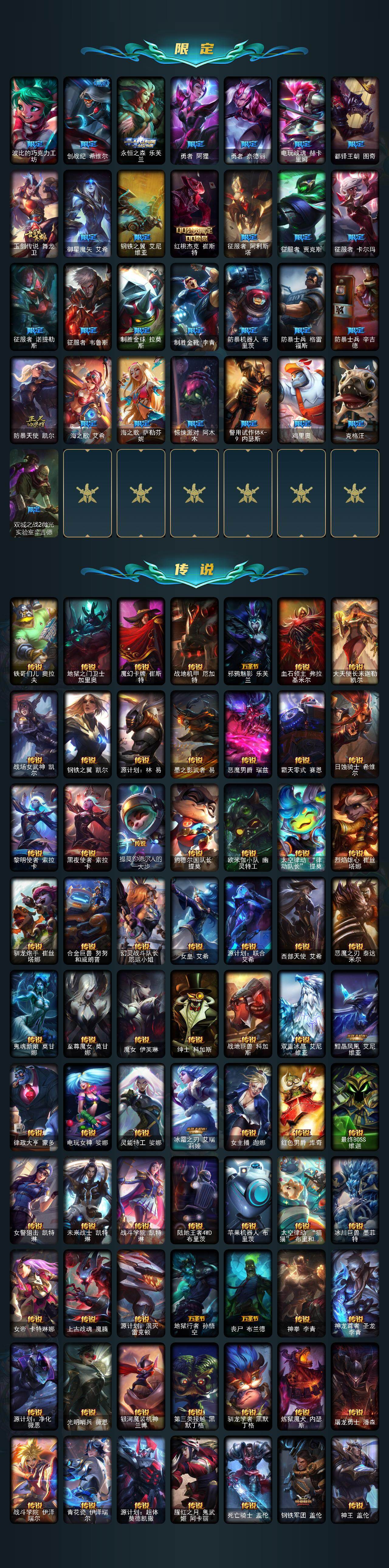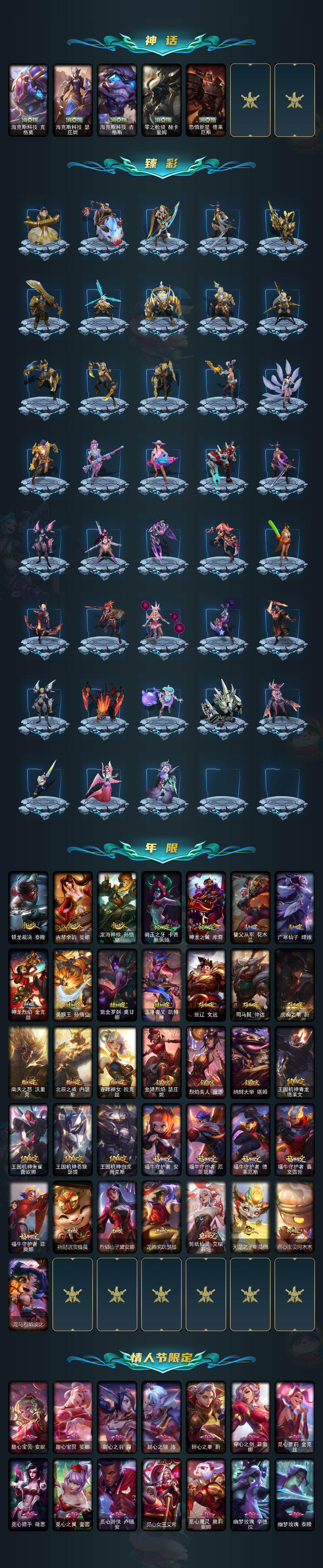 【神话皮肤】:十周年纪念安妮,源代码乐芙兰,殿堂传奇乐芙兰,十五周年纪念希维尔,新卧虎藏龙贾克斯,暗星科加斯,神凰行者瑞羽圣