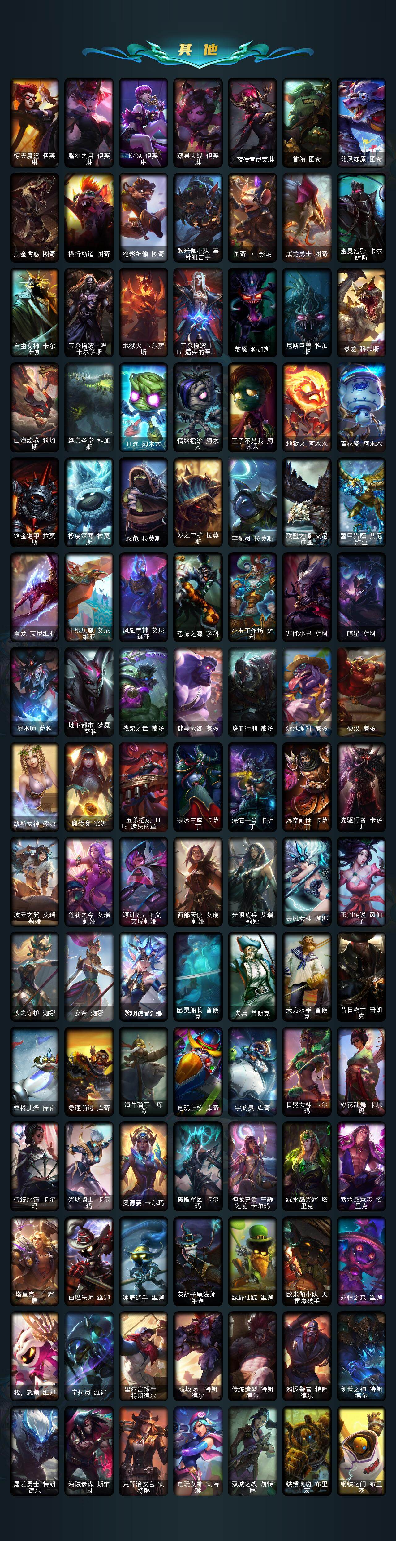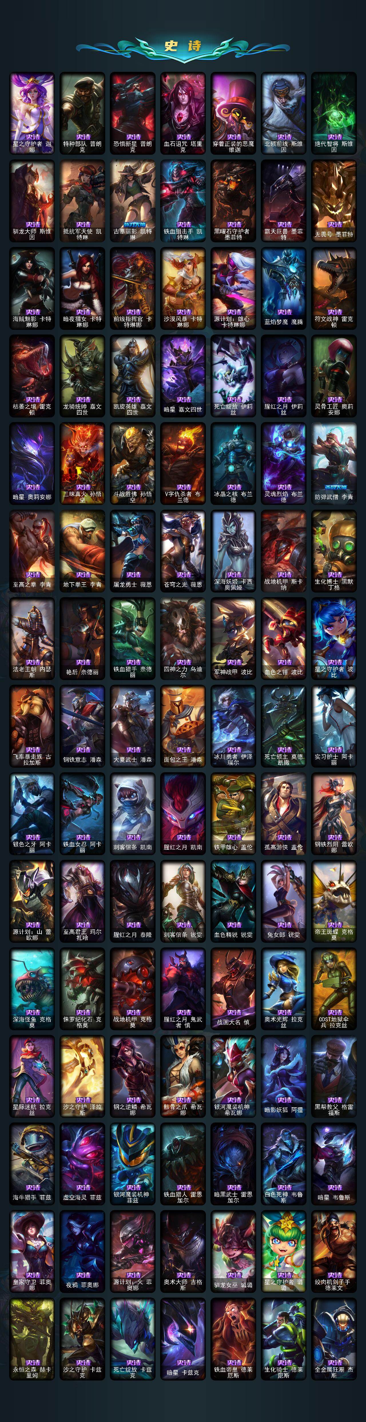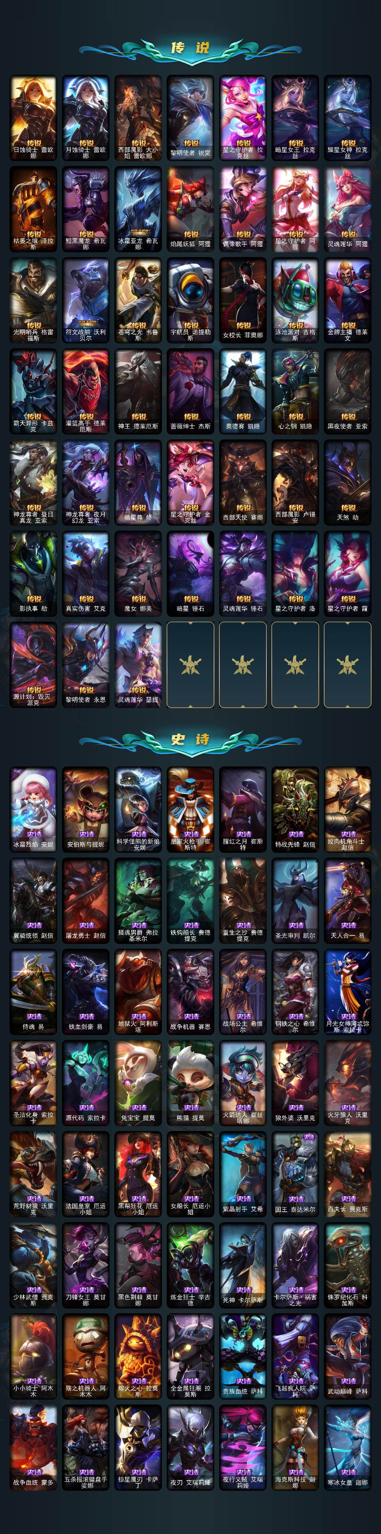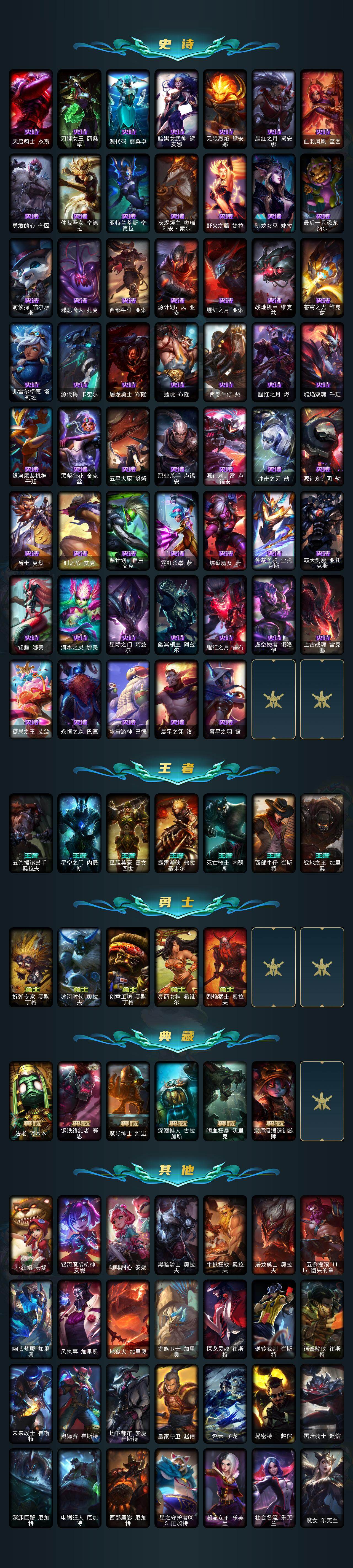 【神话皮肤】:十周年纪念安妮,源代码乐芙兰,殿堂传奇乐芙兰,十五周年纪念希维尔,新卧虎藏龙贾克斯,暗星科加斯,神凰行者瑞羽圣