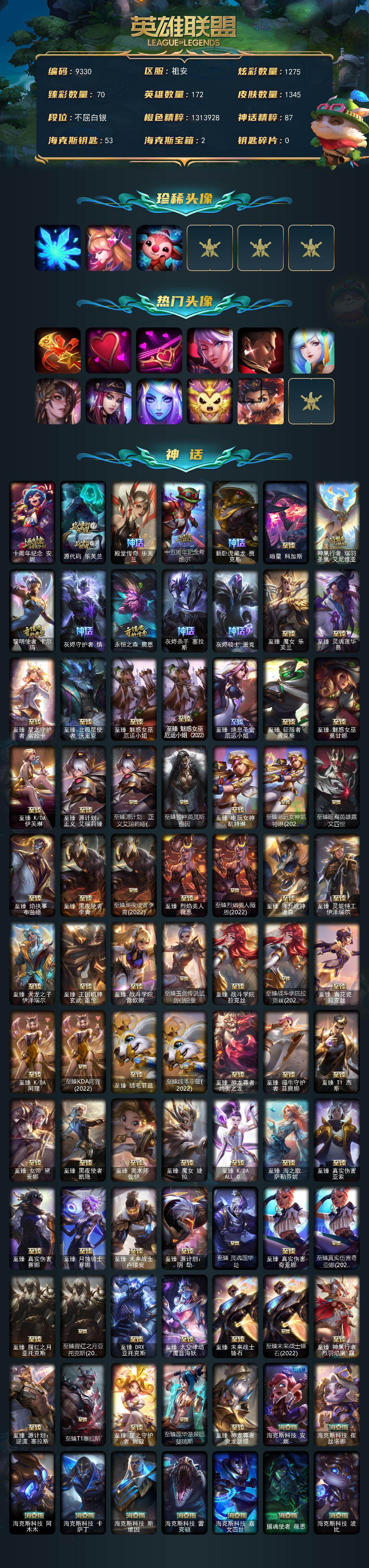 白银段位-172英雄-1345皮肤-1275炫彩-8终极-89神话-2