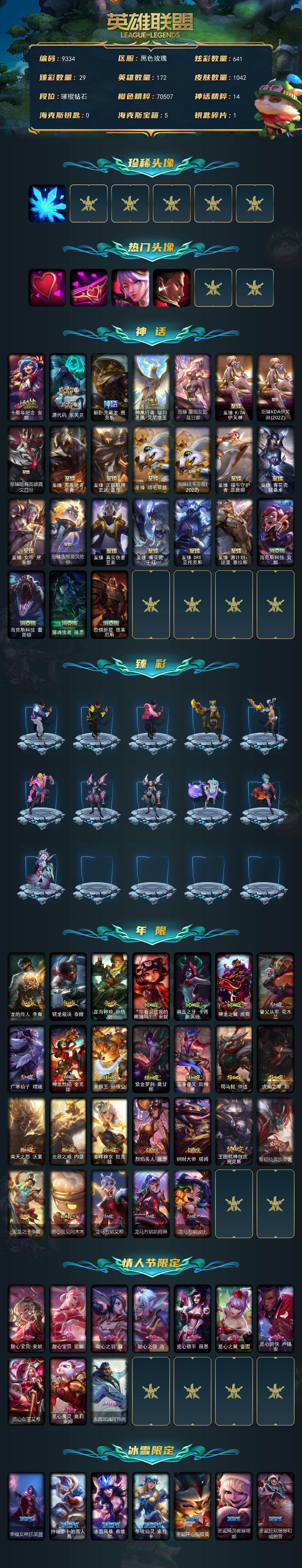 【龙瞎 三个炫彩一个原皮 皇冠号】钻石段位-172英雄-1042皮肤-641炫彩-5终极-24神话-203限定-95传说-215史诗
