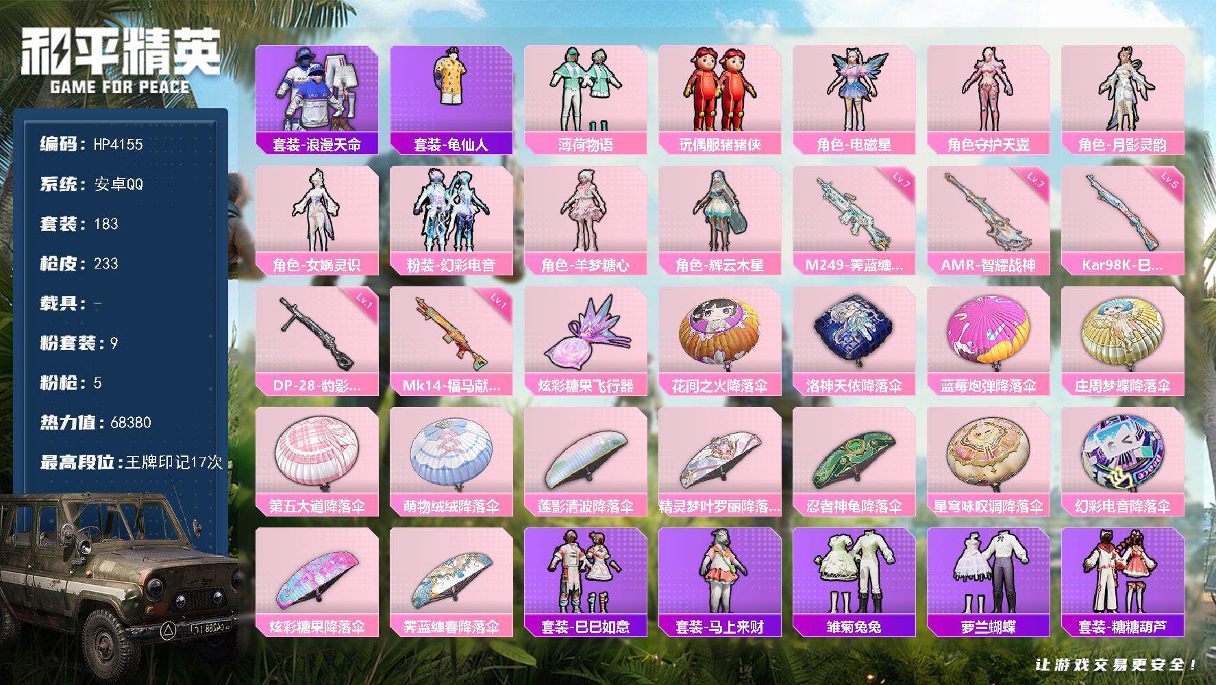 【HP4155】183套装/枪械5/装备320/战备167/王牌印记17/热力值68380/五级Kar98K-巳巳如意/一级Mk14-福马献瑞/七级AMR-智耀战神/七级M249-霁蓝缠春/一级DP-28-豹影疾电/套装-浪漫天命/套装-龟仙人/粉装-薄荷物语/玩偶服-猪猪侠/角色-电磁星/角色-守护天翼/角色-月影灵韵/角色-女娲灵识/粉装-幻彩电音/角色-羊梦糖心/角色-辉云木星/Kar98K-巳巳如意/Mk14-福马献瑞/AMR-智耀战神/M249-霁蓝缠春/DP-28-豹影疾电/炫彩糖果