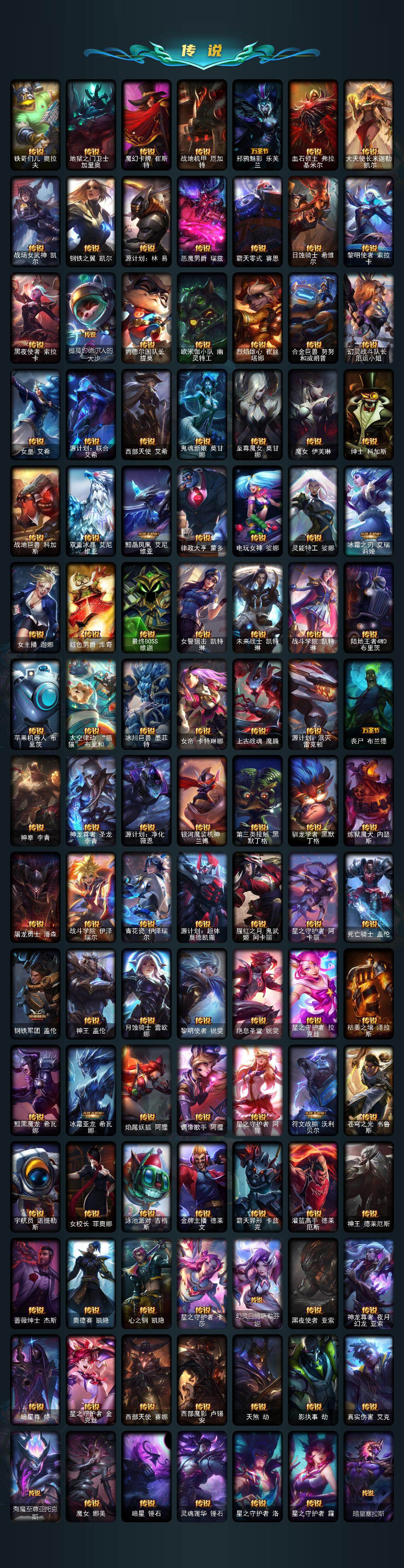【神话皮肤】:十周年纪念安妮,源代码乐芙兰,殿堂传奇乐芙兰,十五周年纪念希维尔,水晶圣骑艾希,神凰行者瑞羽圣凰艾尼维亚,黎明使者卡尔玛,水晶泰坦诺提勒斯,星之守护者塔莉垭,水晶圣