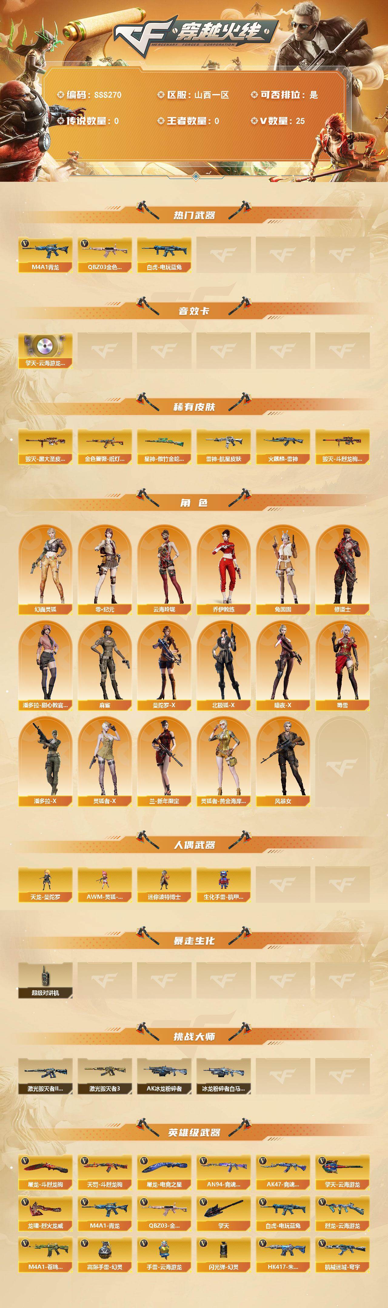 山西一区-30V-0王者武器数-0炫金武器数【热门武器】:QBZ03-金色蔷薇,M4A1-青龙,白虎-电玩蓝兔【音效卡】:擎天-云海游龙音效卡【皮肤】:金色蔷薇-纸灯龙皮肤,星神-傲竹金蛇 皮肤,雷神-航星皮肤,火麒麟-雷神,毁灭-黑大圣皮肤,毁灭-斗烈龙驹 皮肤【角色】:零·纪元,乔伊教练,修道士,云海玲珑,幻面灵狐,暗夜-X,北极狐-X,风暴女,兰-新年限定,灵狐者-X,灵狐者-黄金海岸,麻雀,曼陀罗-X,潘多拉-X,潘多拉-甜心教官,蜀雪,兔囡囡【人偶武器】:天龙-曼陀罗,AWM-灵狐-1