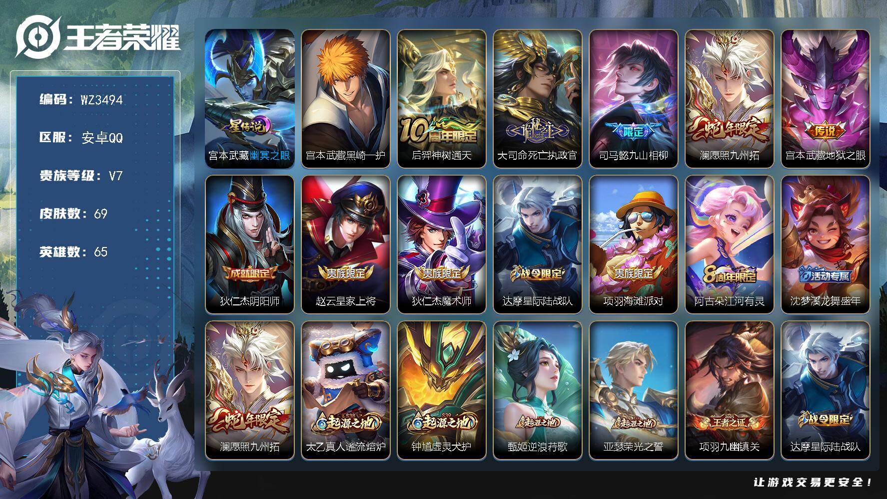 【秒换绑】安卓Q-V7-最强王者段位-65英雄-69皮肤-1珍品传说-5传说-