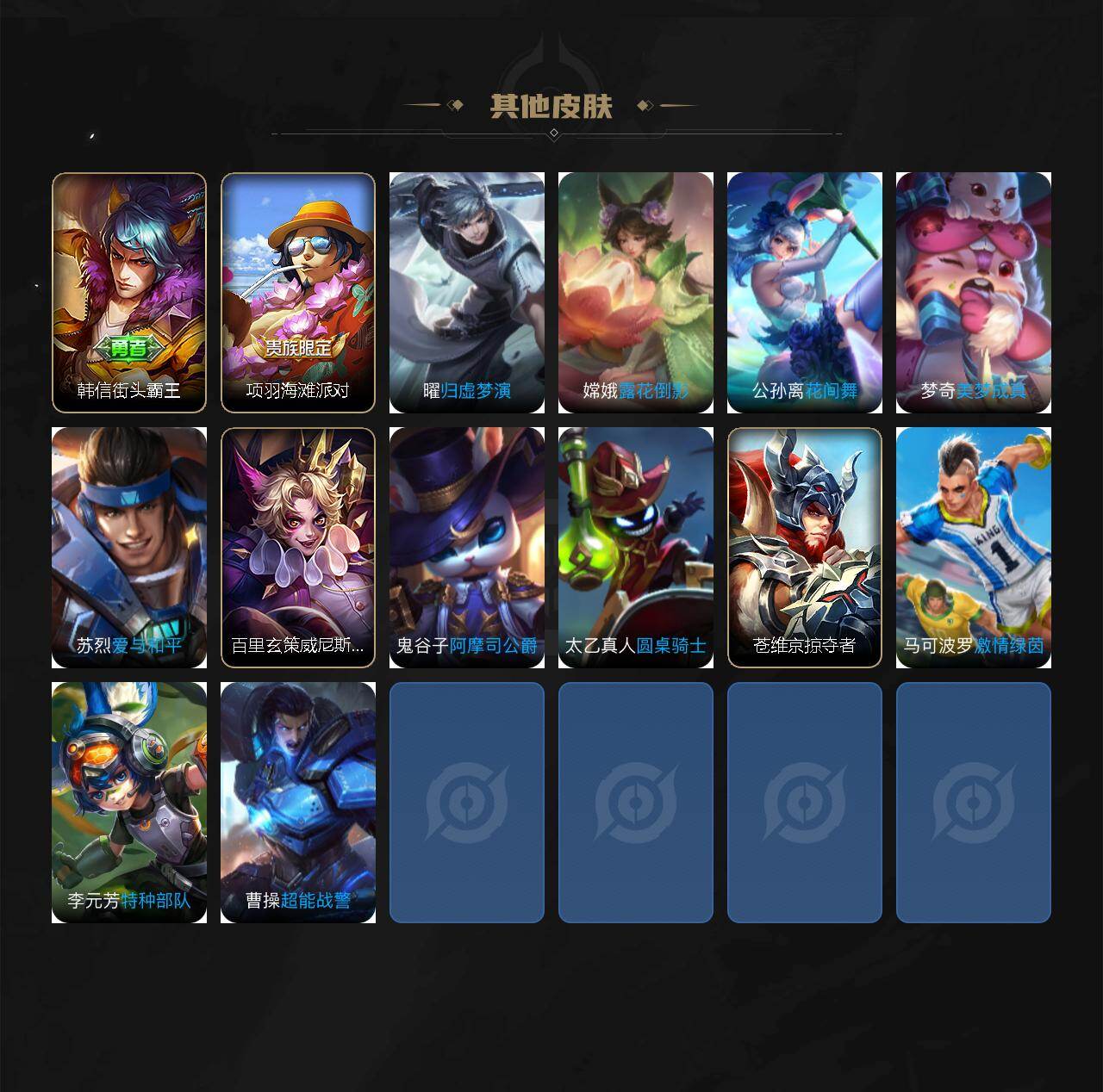 【限定皮肤】:狄仁杰阴阳师,赵云皇家上将,狄仁杰魔术师,达摩星际陆战队,项羽海滩派对,阿古朵江河有灵,沈梦溪龙舞盛年