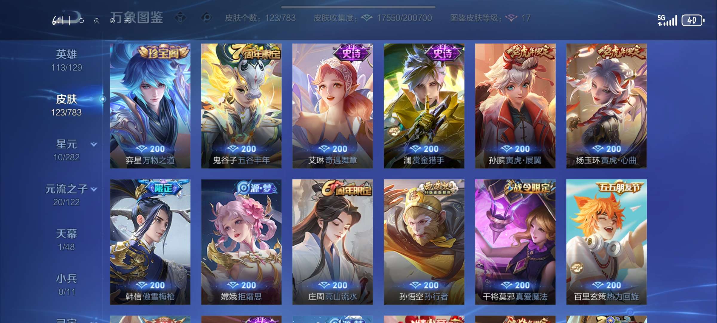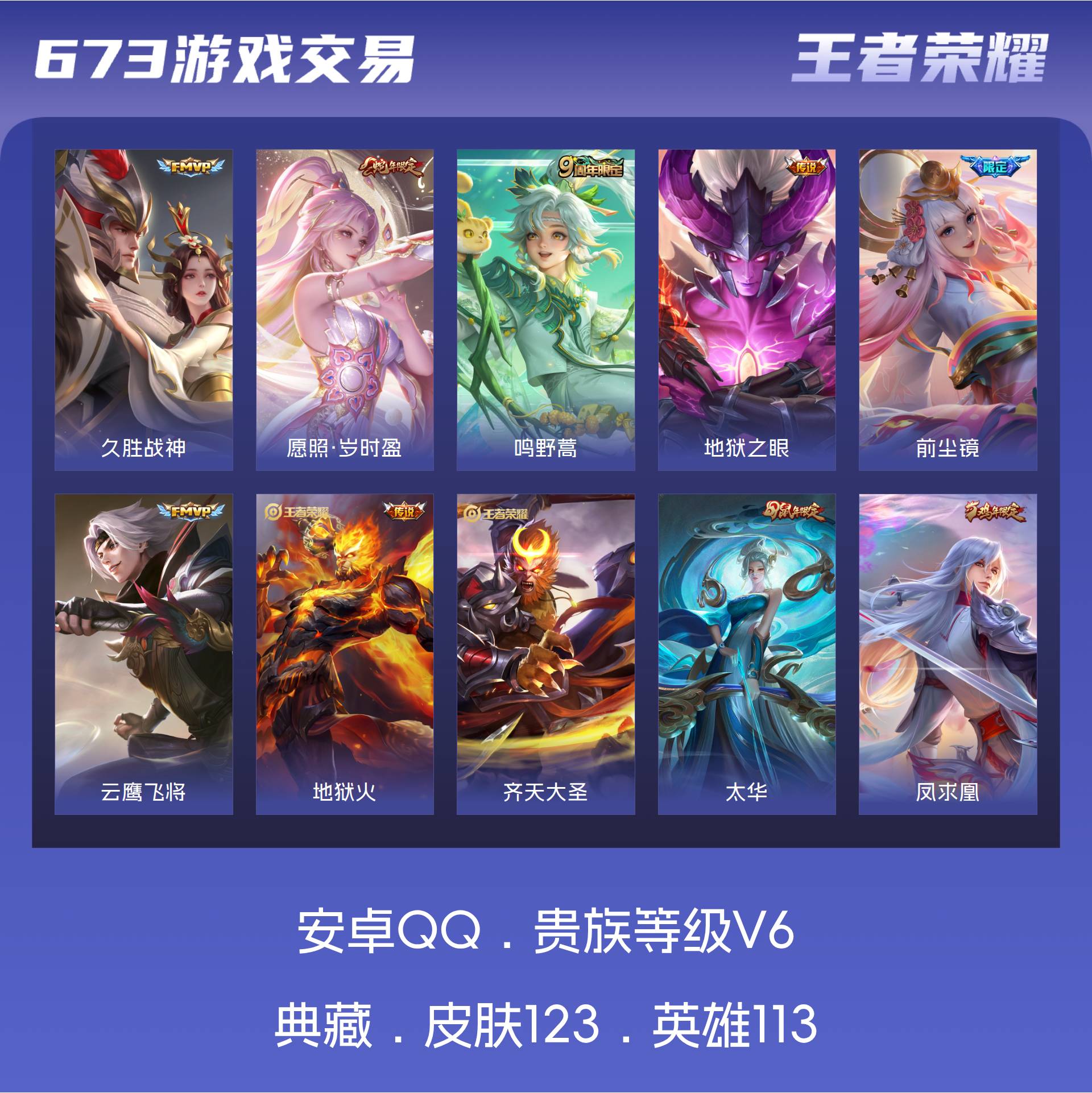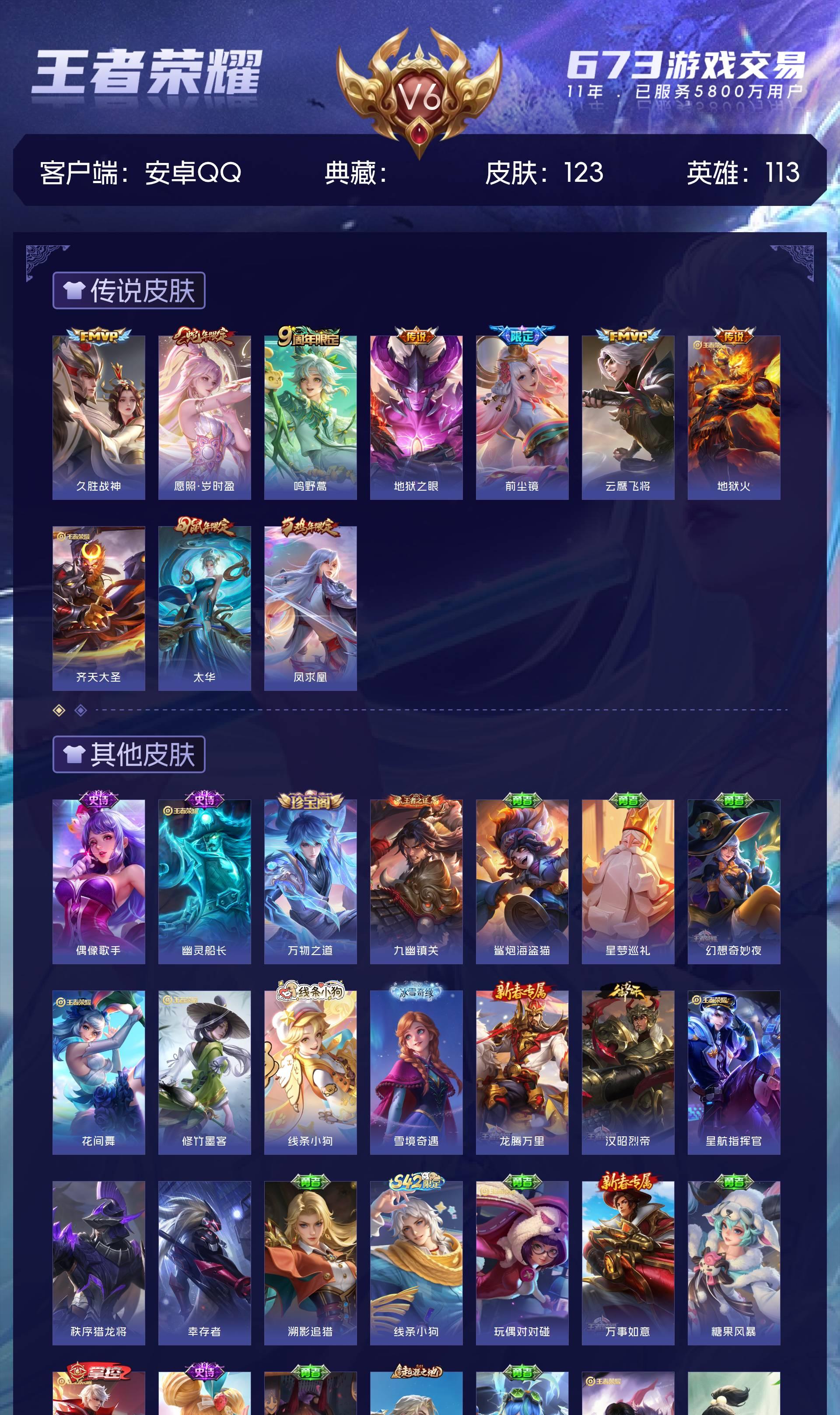 V6 皮肤123 英雄113 非凡王者 传说10 其他皮肤119