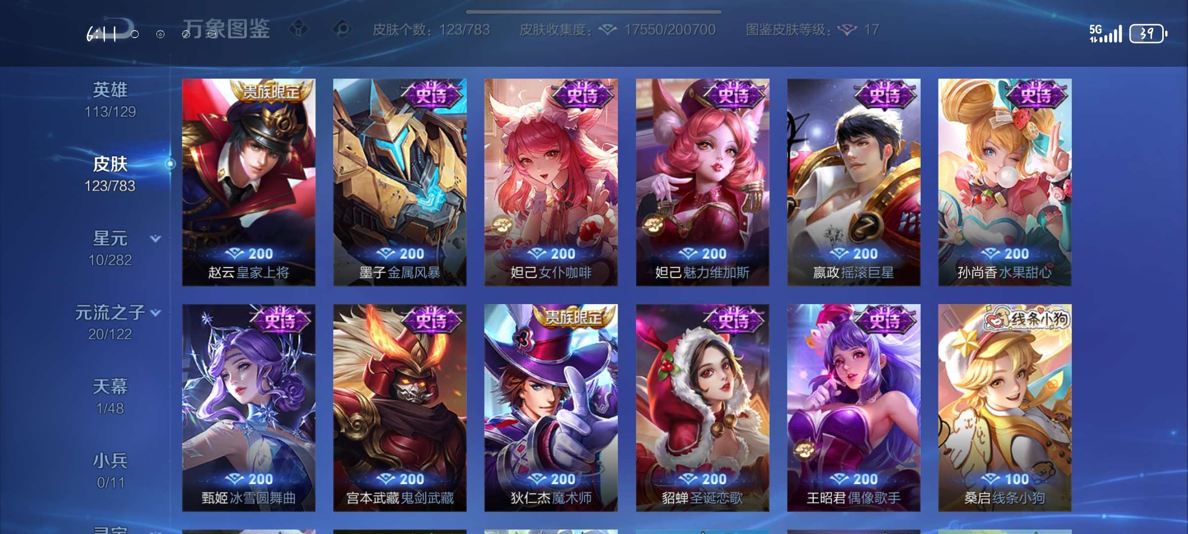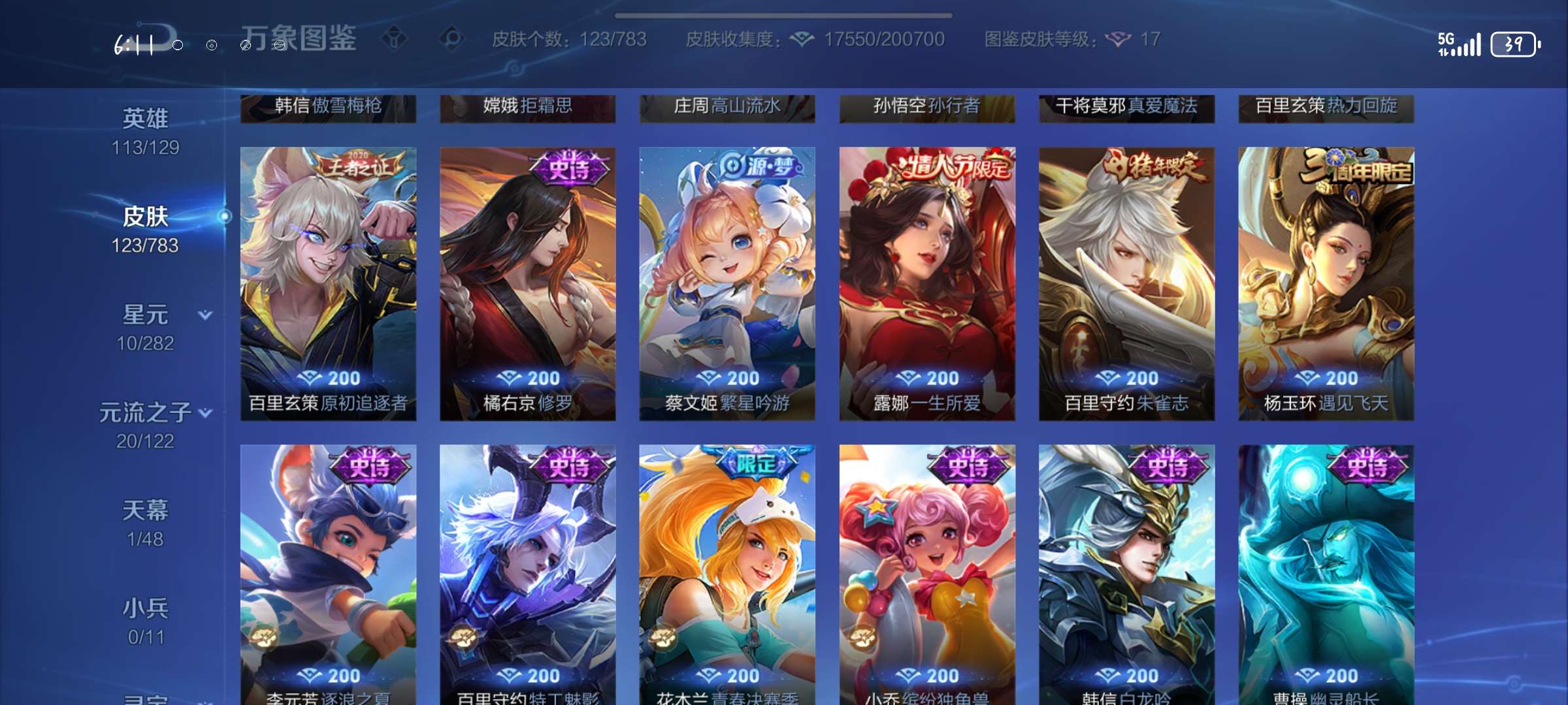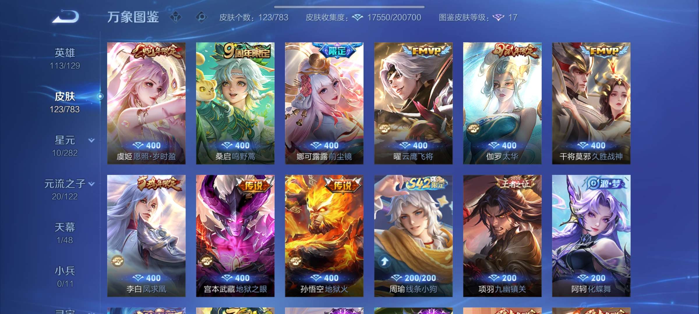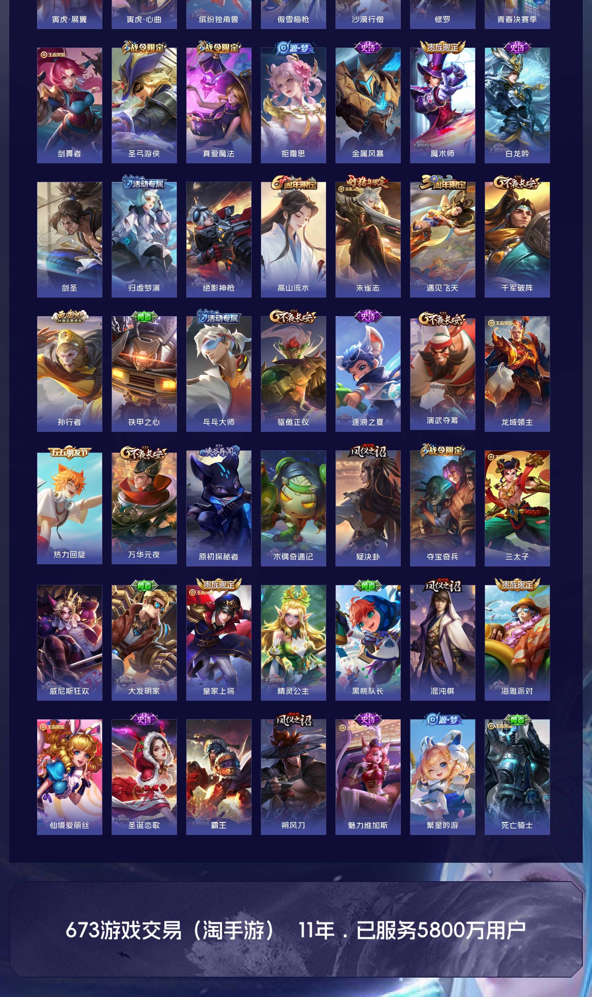 V6 皮肤123 英雄113 非凡王者 传说10 其他皮肤119
