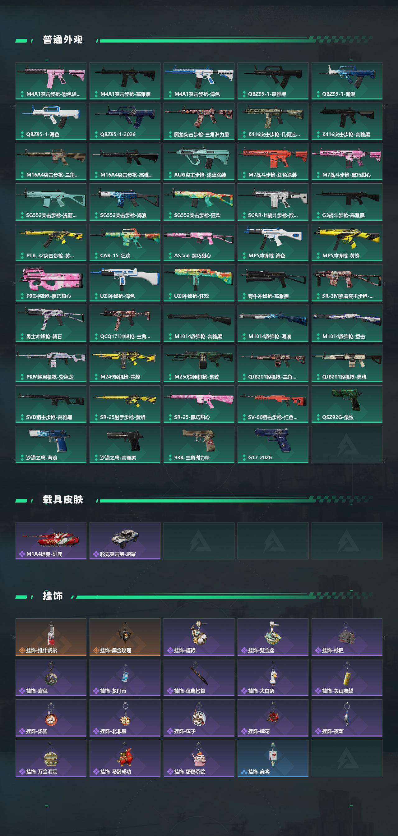 【传说外观】:M4A1突击步枪-阿米娅,ASh-12战斗步枪-鹅鸭杀,AUG突击步枪-悠然茶歇,AK-12突击步枪-纵横,SCAR-H战斗步枪-水墨云图,SCAR-H战斗步枪-启航,G3战斗步枪-骑士,CAR-15突击步枪-阿米娅,腾龙突击步枪-马年祥瑞,腾龙突击步枪-万金泪冠,KC17突击步枪-电锯惊